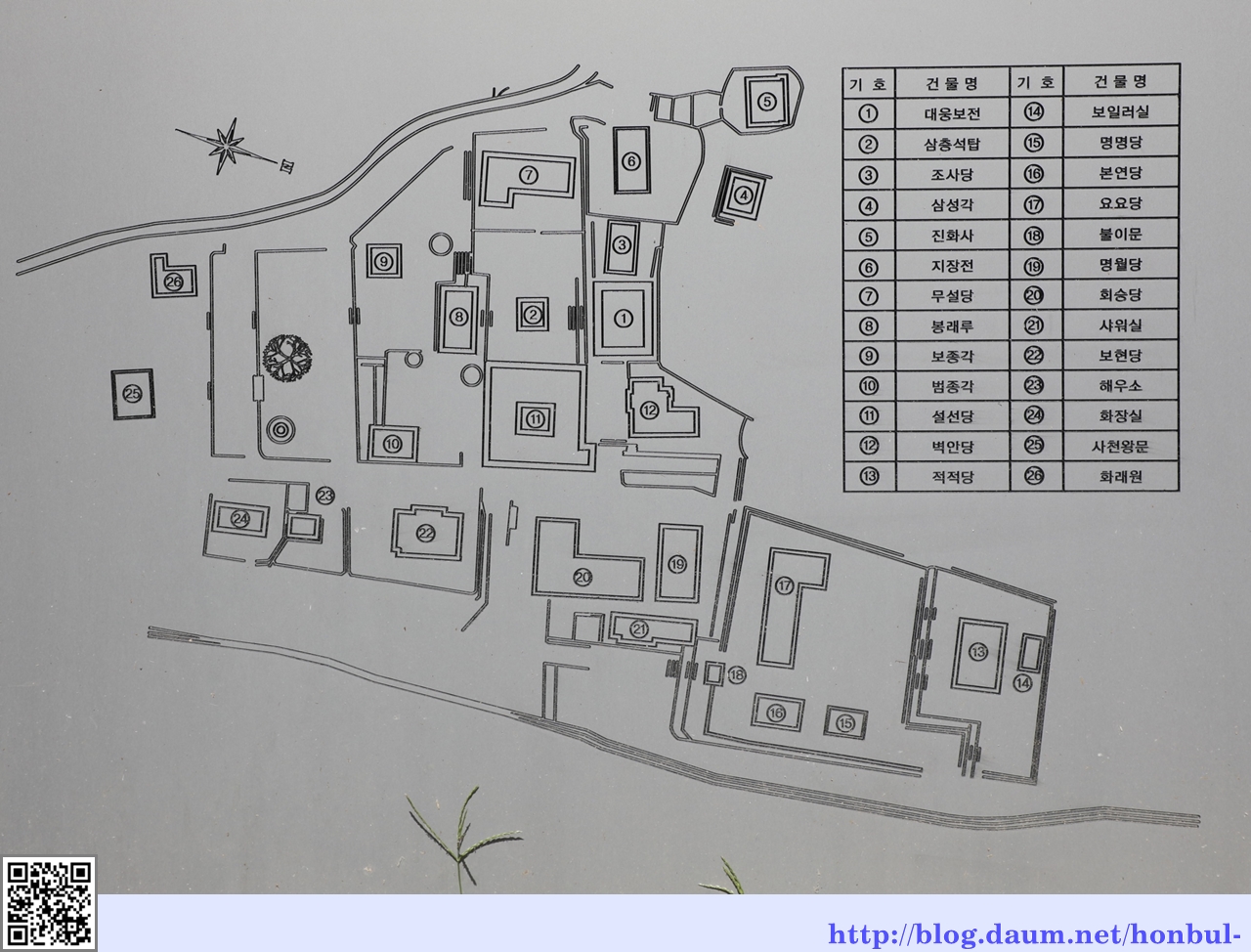 층을 이룬 넓은 마당이 여유롭게 보이는 사찰이다.