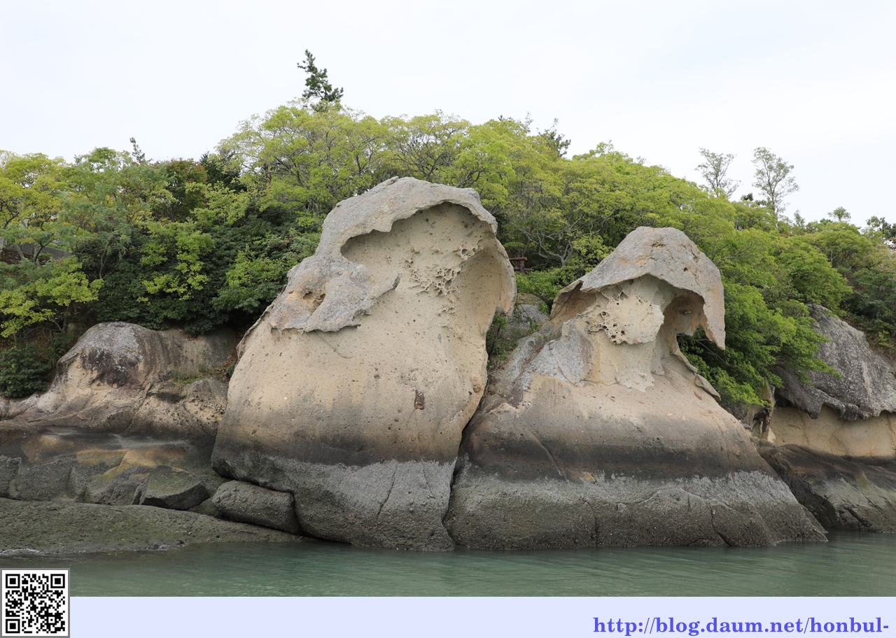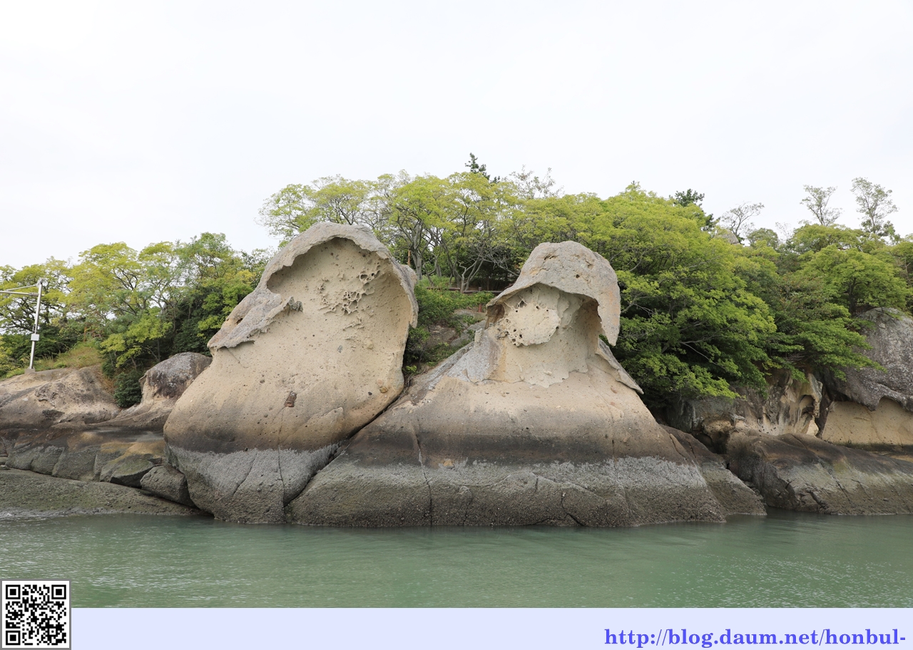 풍화 작용과 해안침식 작용을 동시에 받아 삿갓 쓴 사람 형상으로 깎여나간 풍화혈(風化穴)이다.