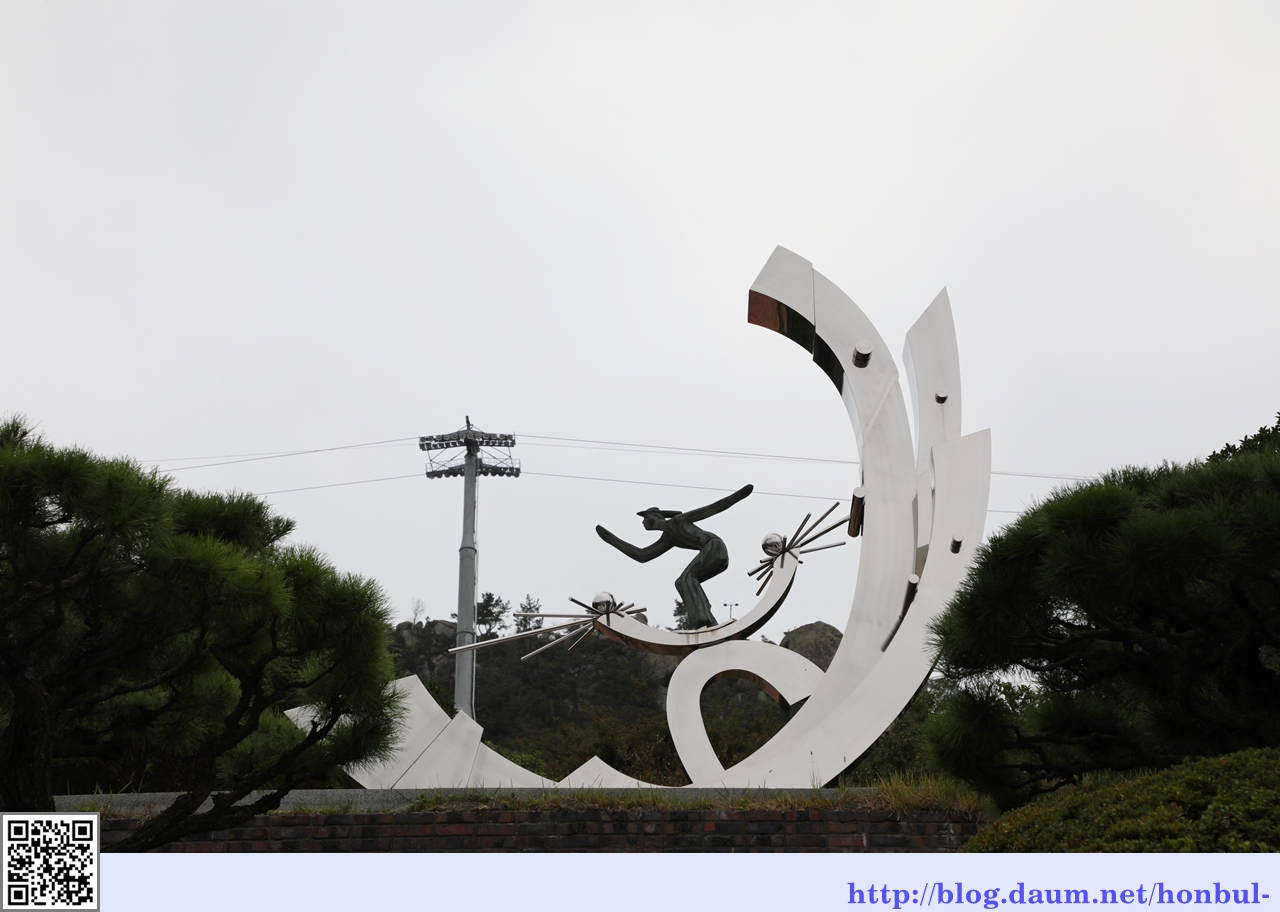 넘실거리는 바다의 파도와 하늘에 떠있는 태양이 달리고 있는 순간의 움직임을 현대조각으로 표현하고 있다.