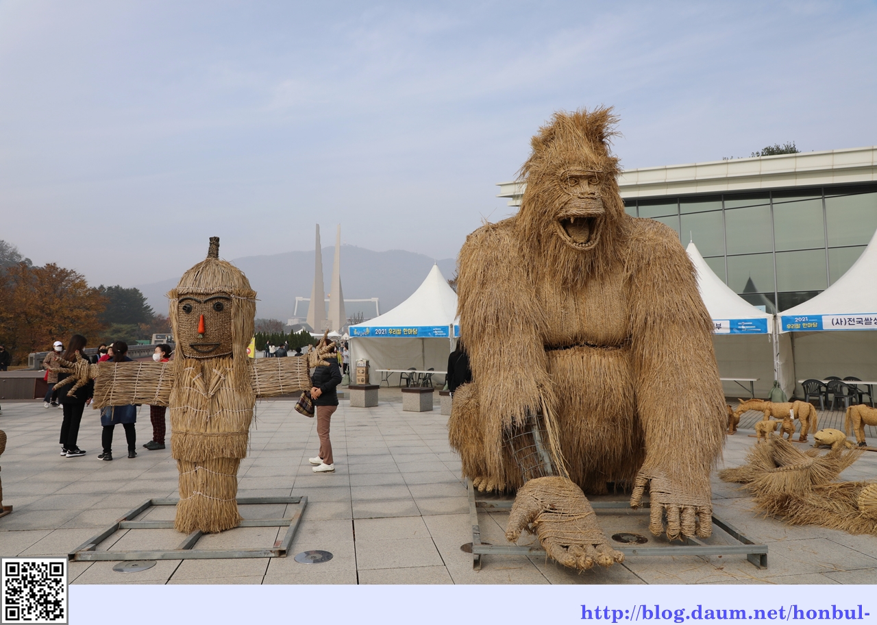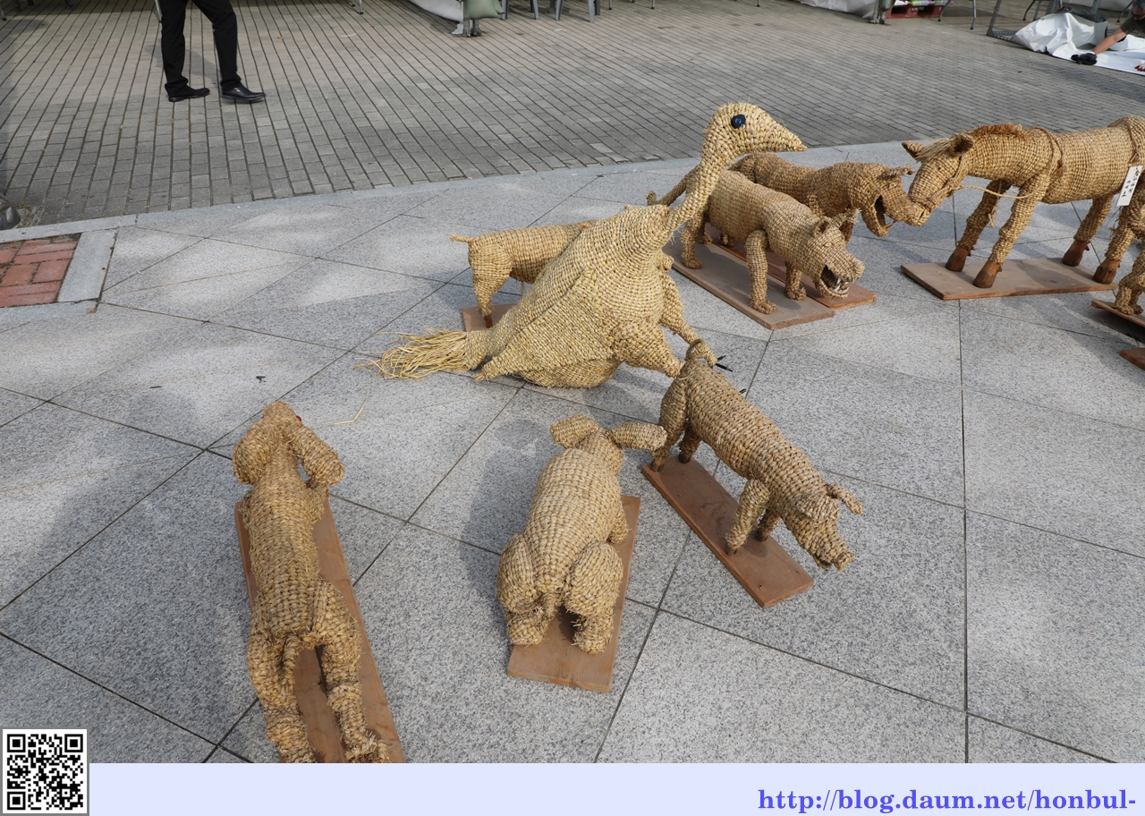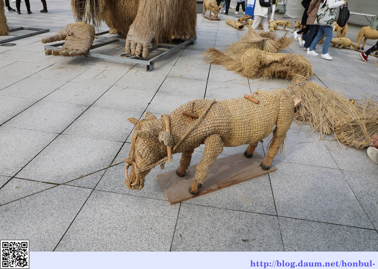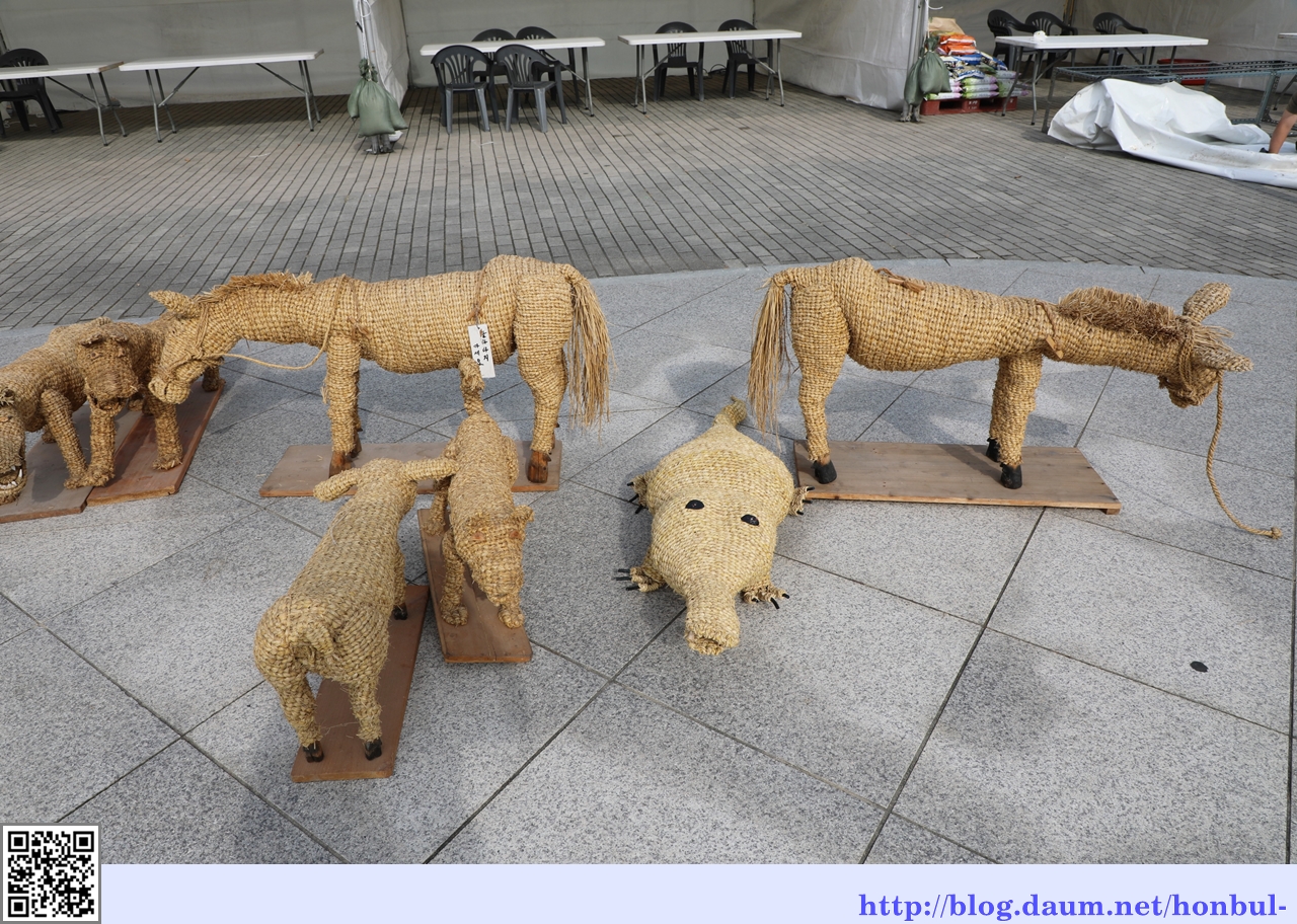 광장엔 짚과 멍석으로 만든 여러 작품이 전시되어 있다.