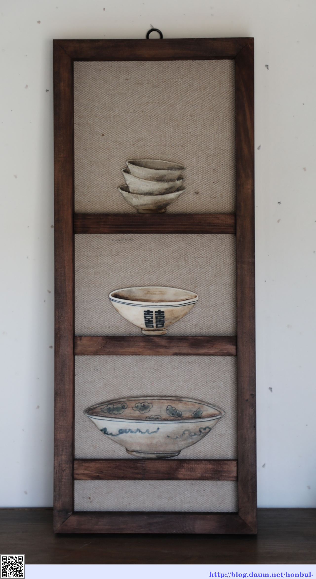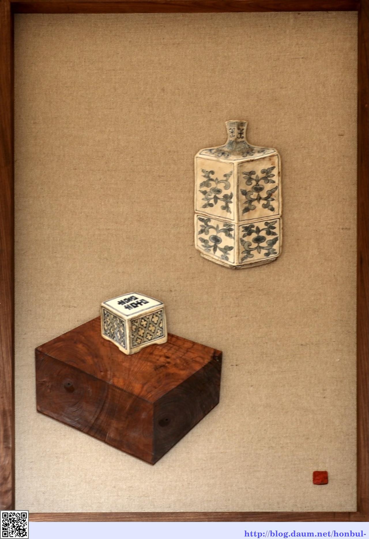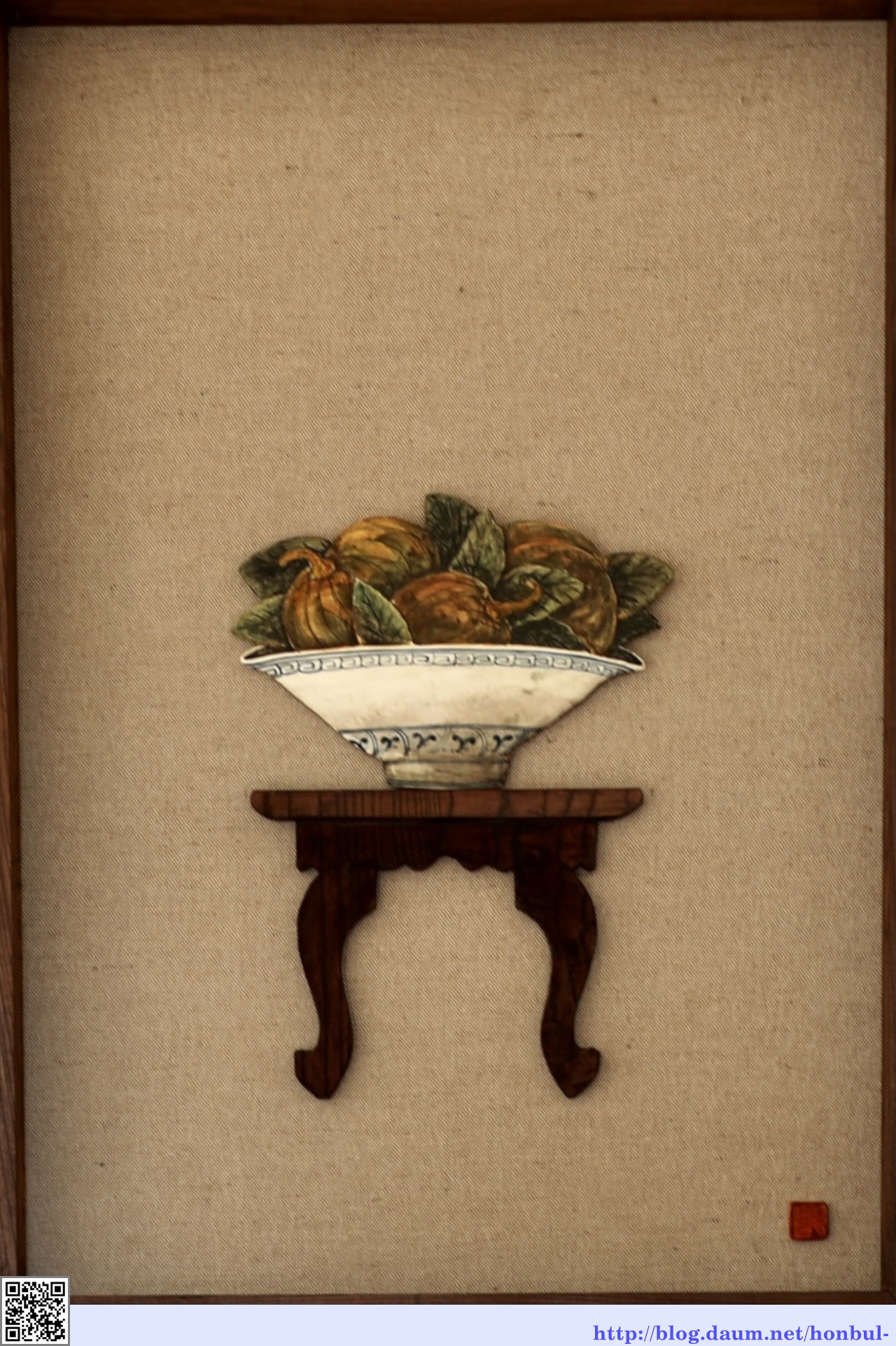도자기와 위에 놓은 과일은 평면 도자기에 그림을 그려 배경인 천에 붙인 것이다.