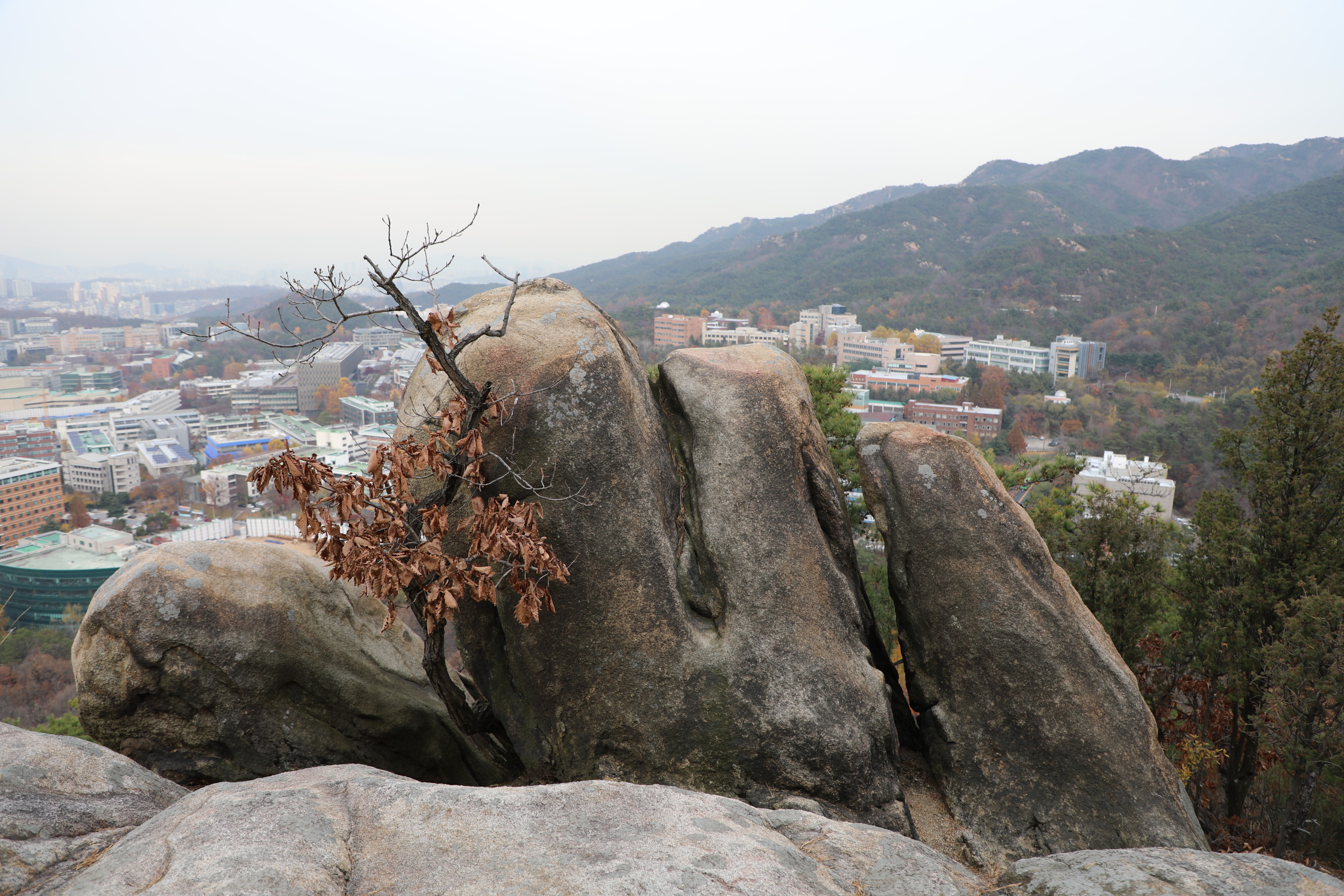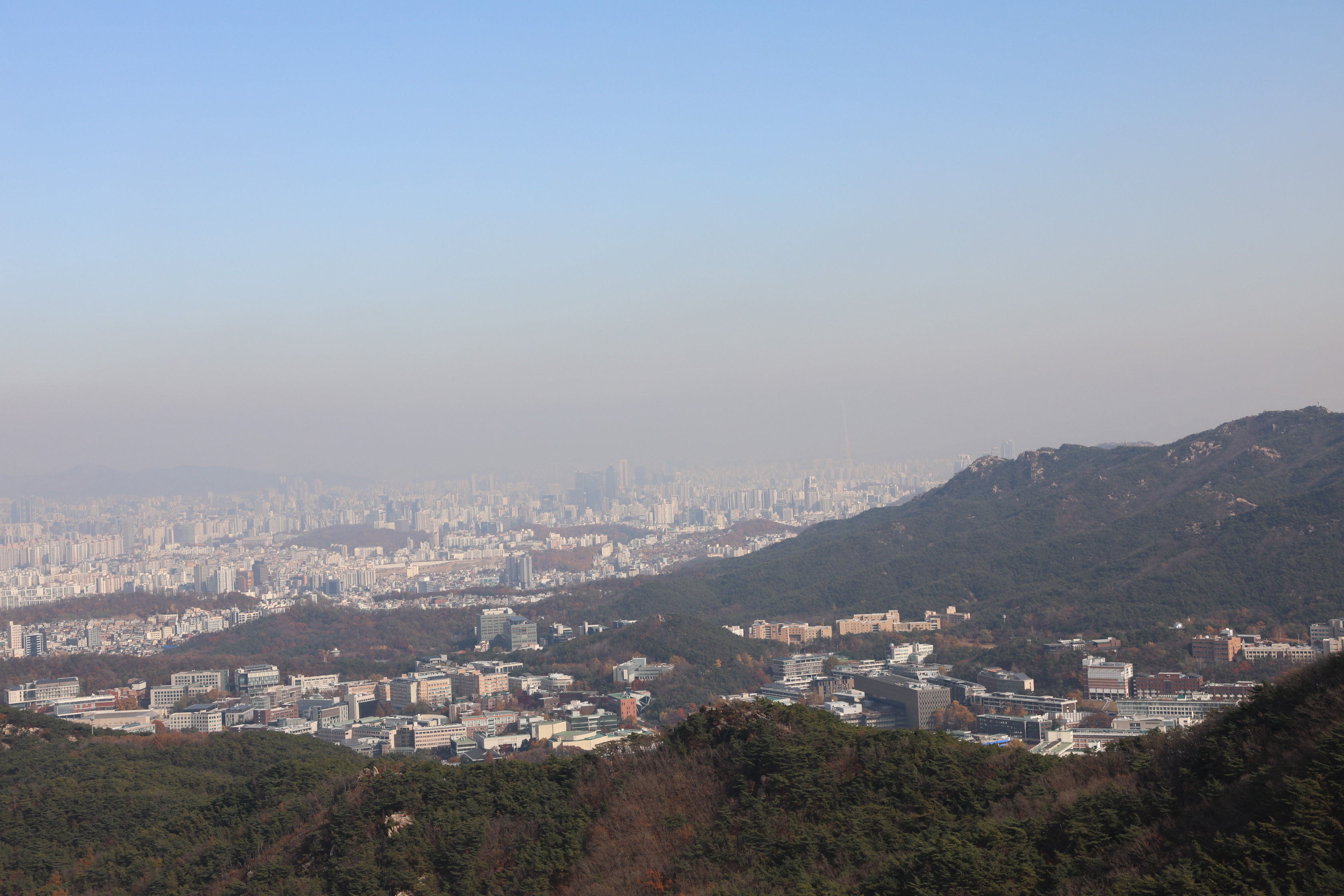 관악산 계곡 사이에 있는 서울대 전경