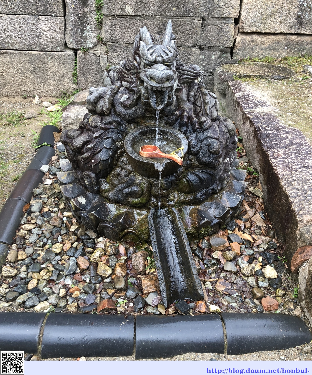 대웅전 축대 앞에는 괘불을 고정한 용두를 조각하여 불전을 수호하는 벽사의 뜻을 강하게 표현하고 있다. (안내문)