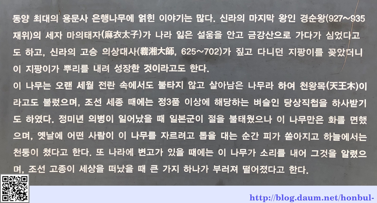 정미년 의병이 일어났을 때 일본군이 절을 불태웠으나 이 나무만은 화를 면했다. (안내문)
