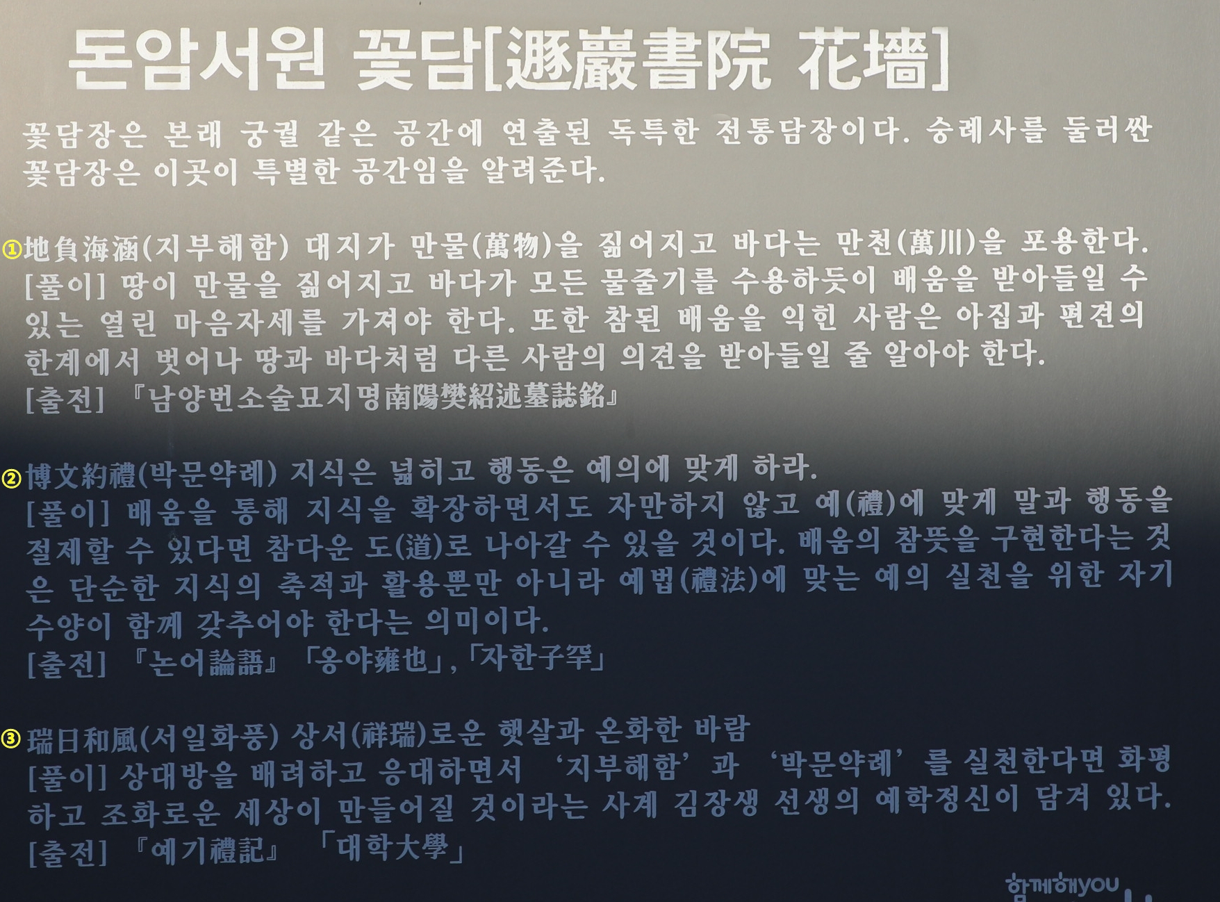 ‘돈암서원’ 사당인 ‘숭례사’ 앞 꽃담에 한문 12자로 적혀 있는 조선 중기 대표적인 유학자
