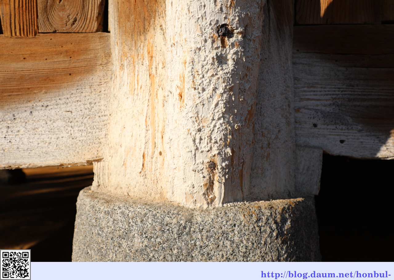 건물이 오래되다 보니 좀이 스는 걸 방지하기 위해 주춧돌과 맞닿는 기둥에 소금물을 입혔다.