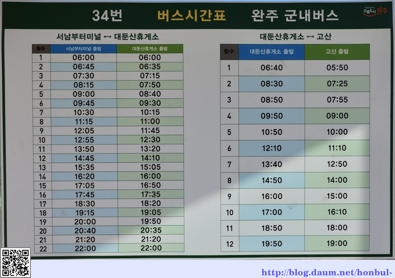○ 대전 34번 버스시간표, 완주 군내버스(대둔산 휴게소↔고산) 시간표