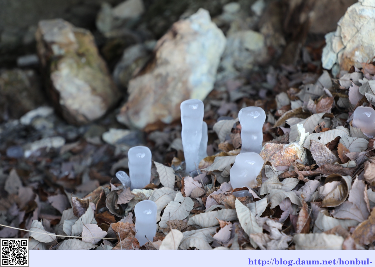 월류봉에서 바로 올라가는 길이 없어 한참을 찾은 끝에 겨우 길을 발견해 오르다 만난 작은 굴 속의 역고드름이다.