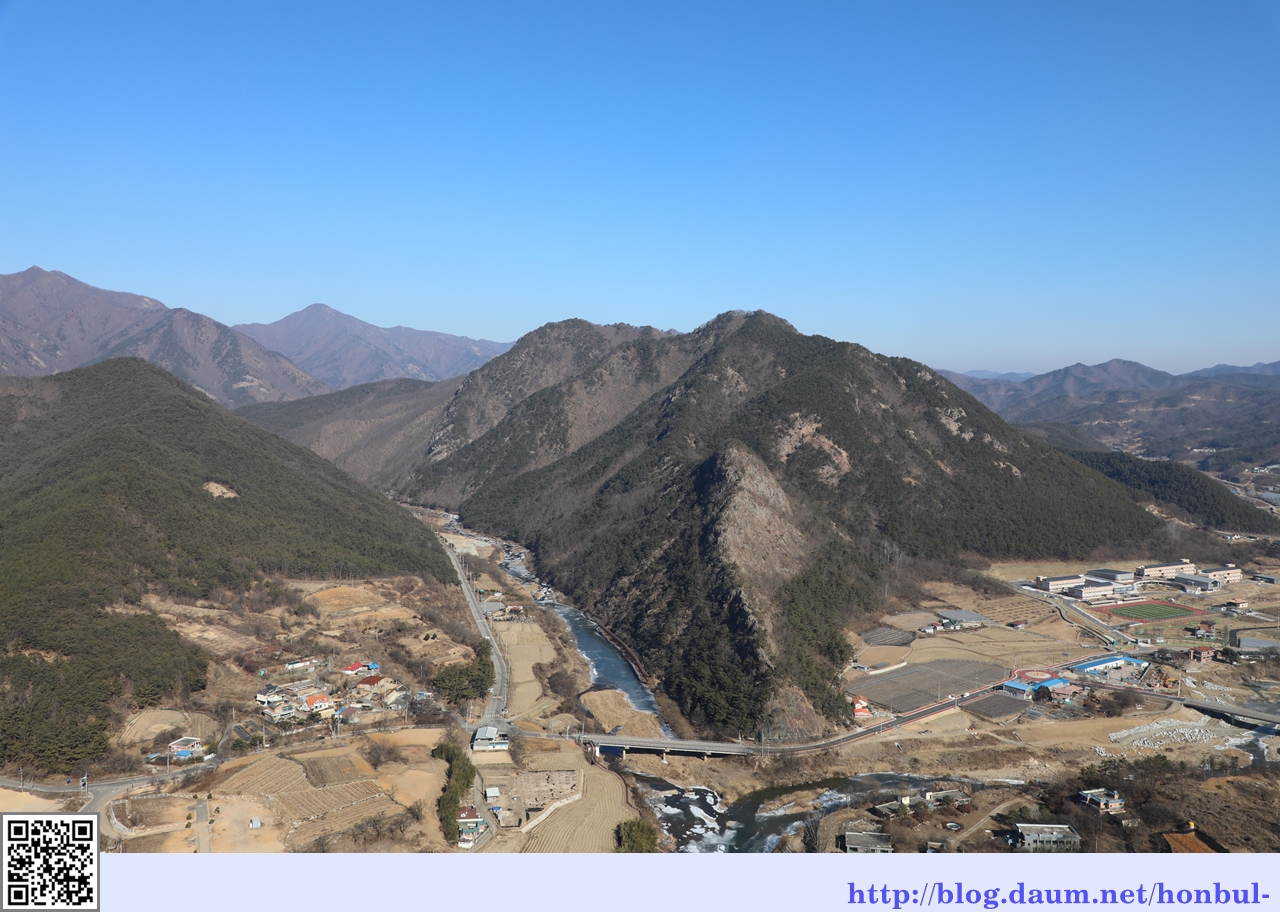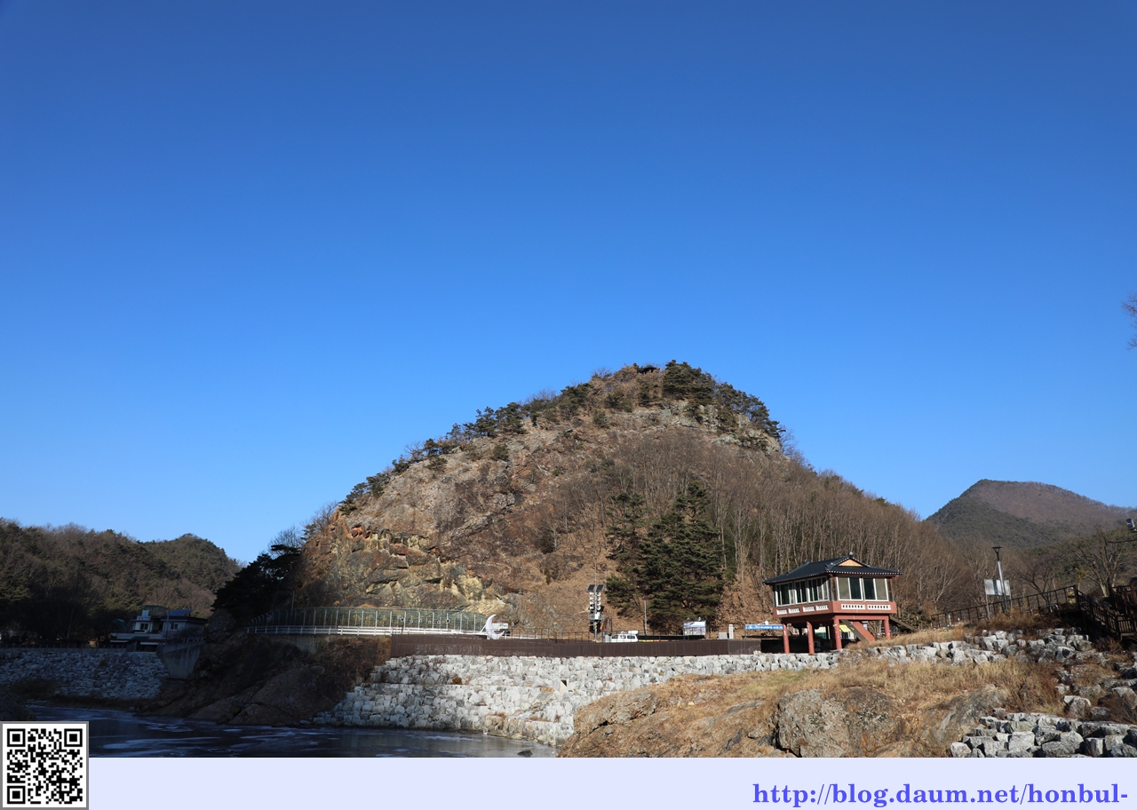 초강천 앞으로 대한민국 지도 모양의 작은 동산이 보이고, 우측 산은 100m 높이의 왕산이다.