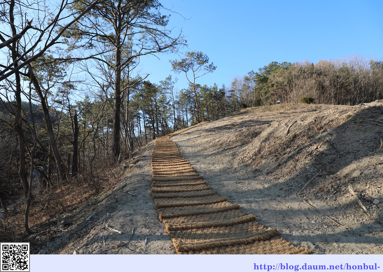월류봉 들머리엔 야자매트를 깔아 걸을 때 등산화에 딸려 오르는 먼지를 뒤집어쓰지 않아 좋다.
