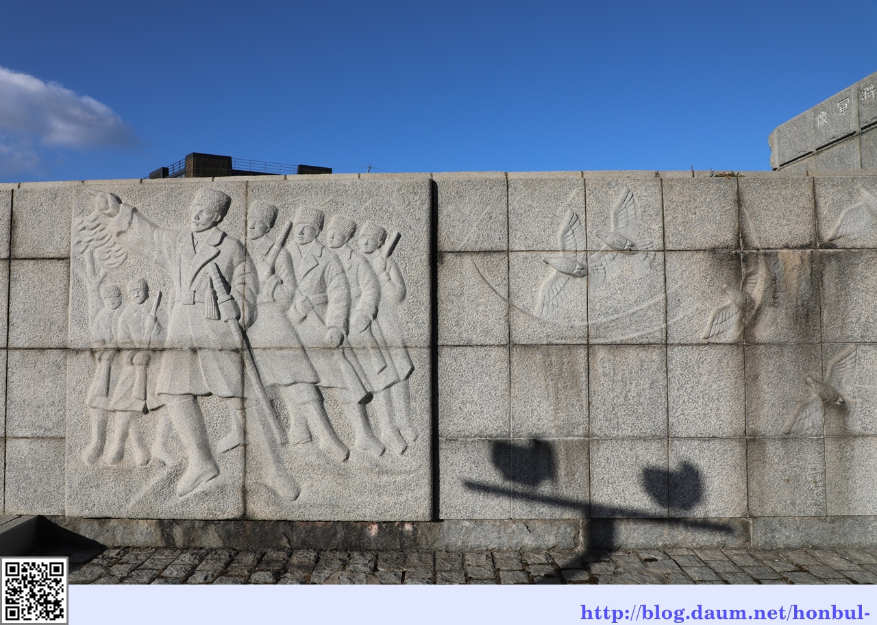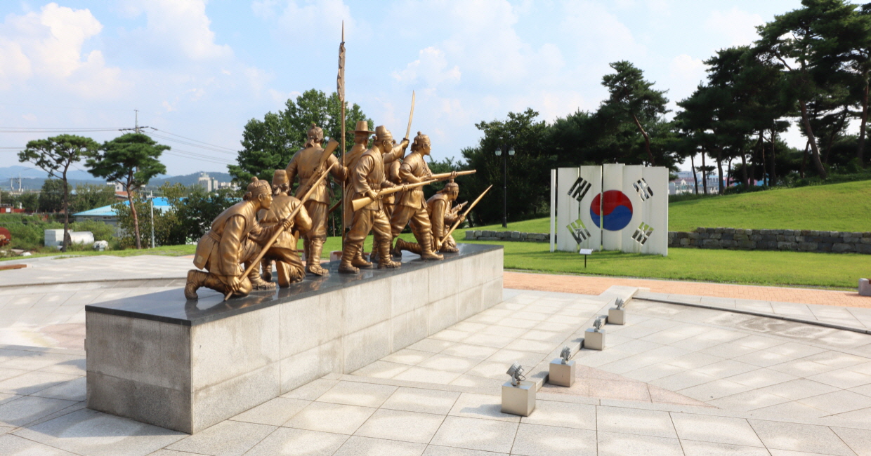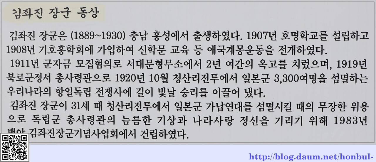 이 조형물에 들어가 앞에 있는 칼을 잡고 김좌진 장군처럼 왜군을 가리키며 조국 사랑의 결기를 다지는 곳이다.
