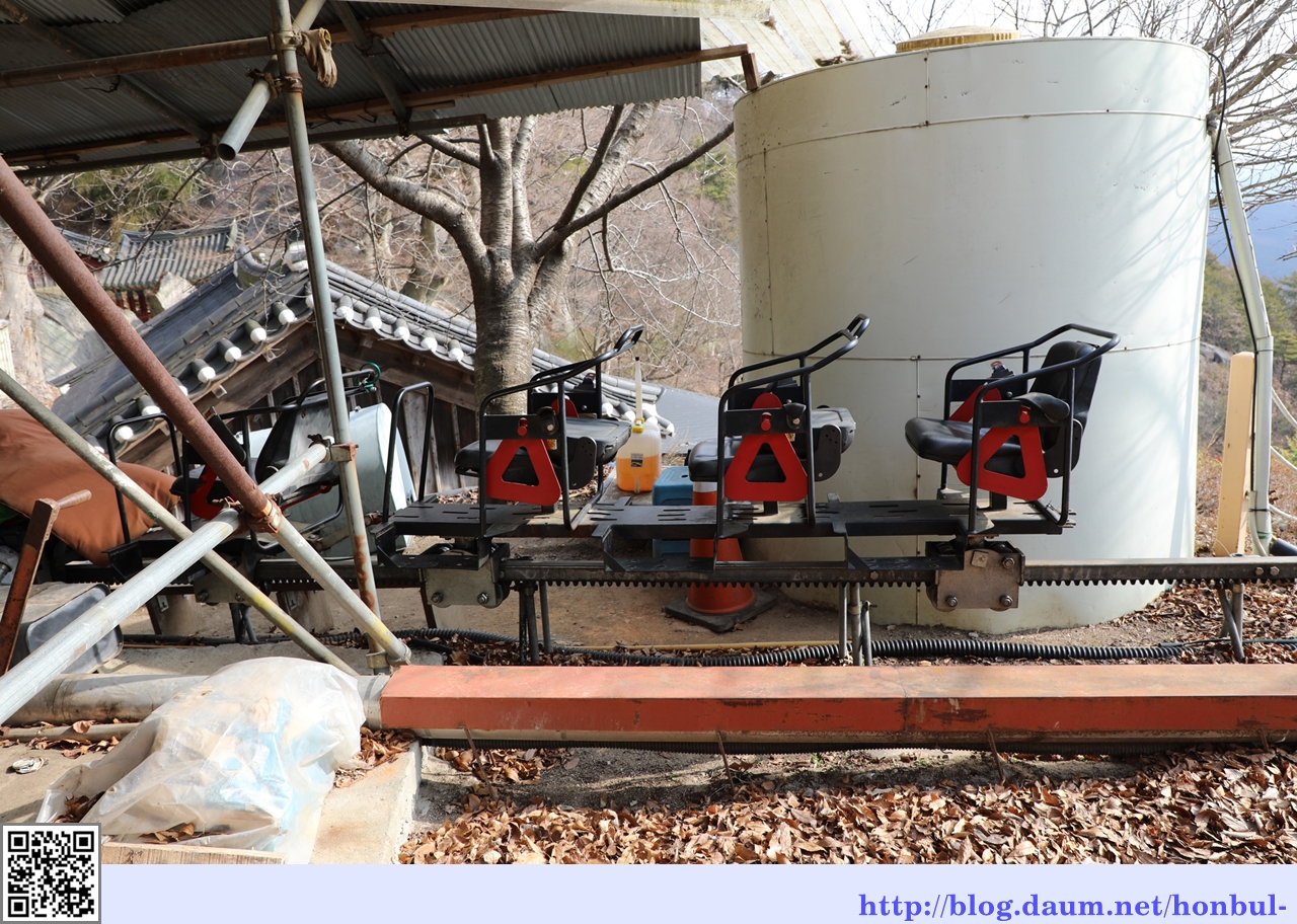 사자사 입구에 운전자를 포함해 4 명이 탈 수 있는 삭도가 설치된 걸 볼 수 있다.