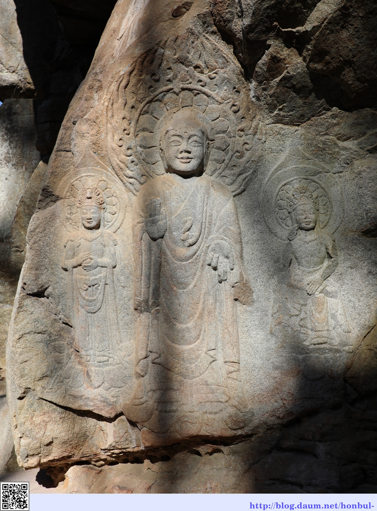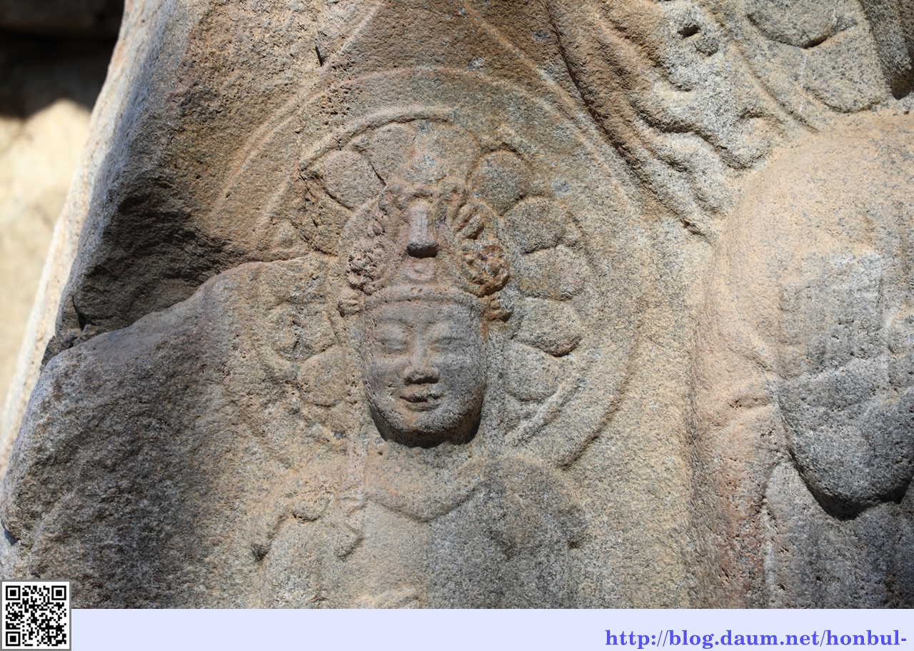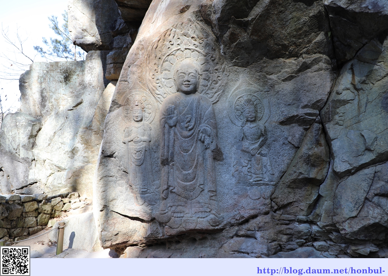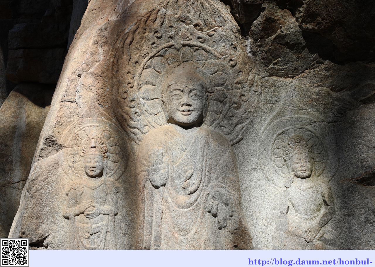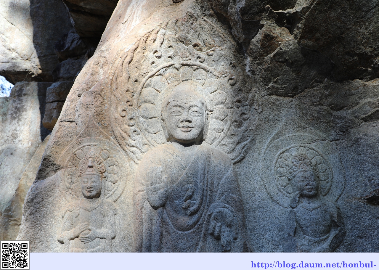 바로 윗단에 모셔진 마애불상은 본존불 양 옆으로 보살상이 함께 계신다.