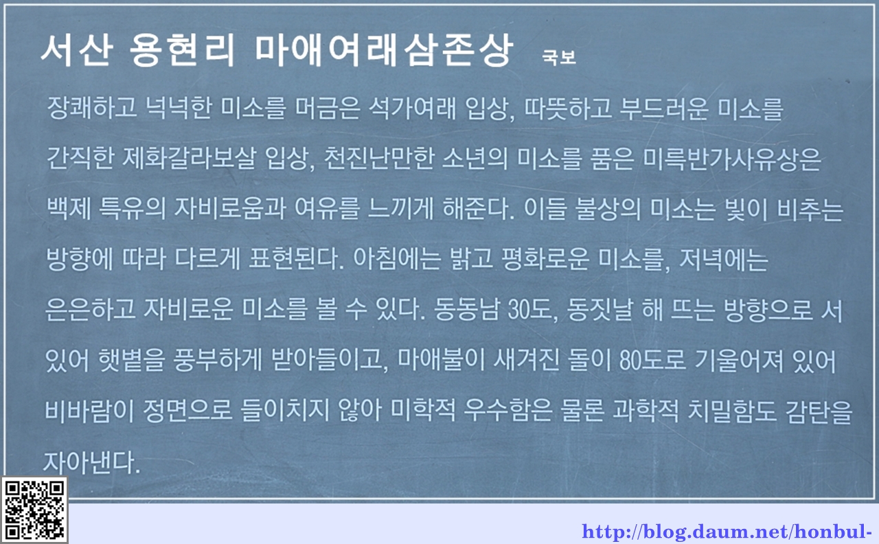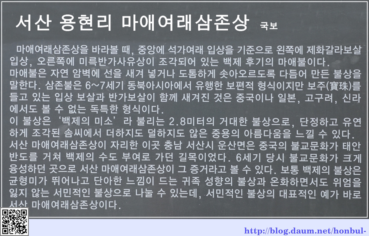 통일신라의 불국사와 석굴암이 석조 문화의 극치라면 백제문화에서 서산 용현리 마애여래삼존상이다.
