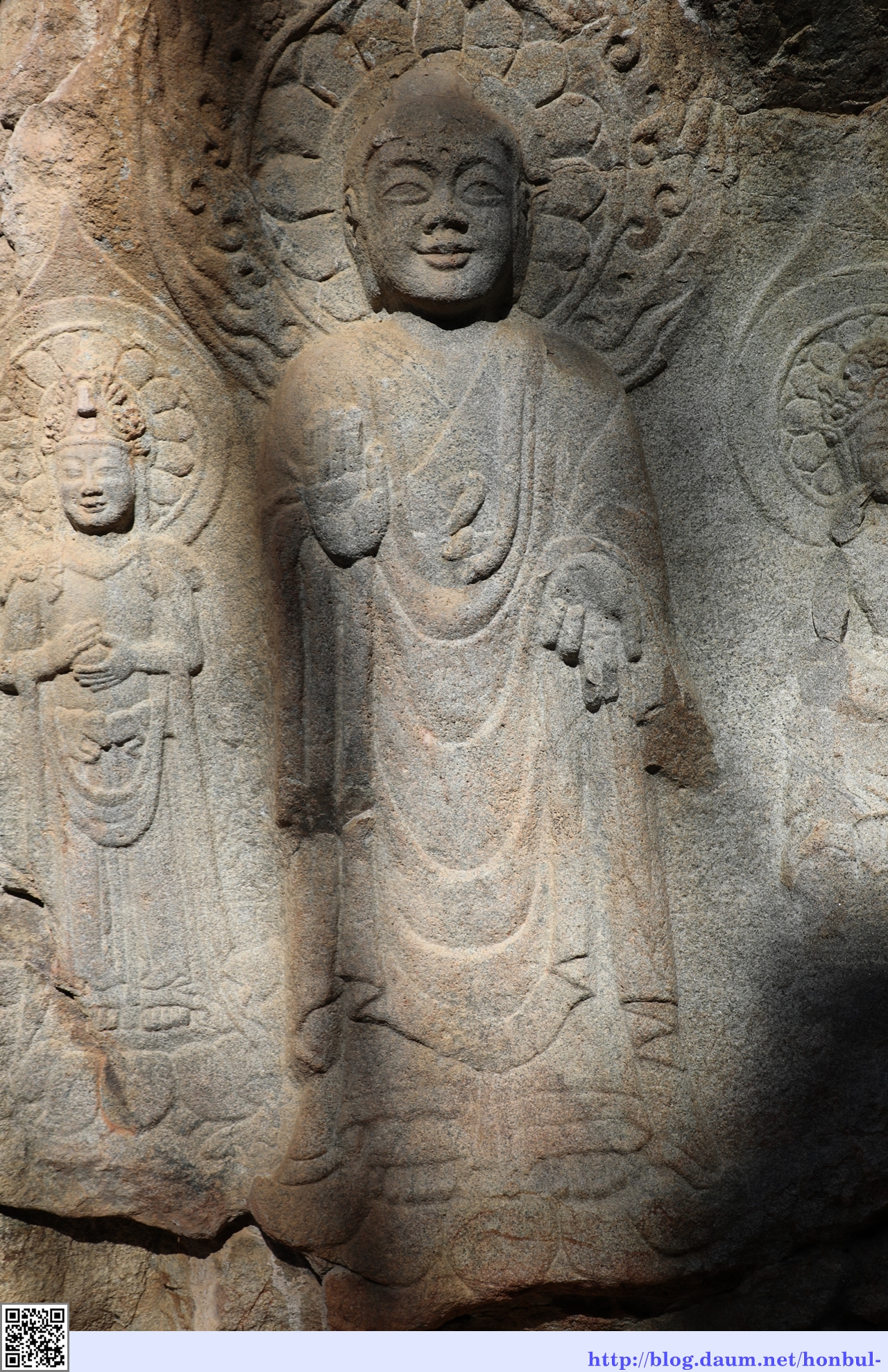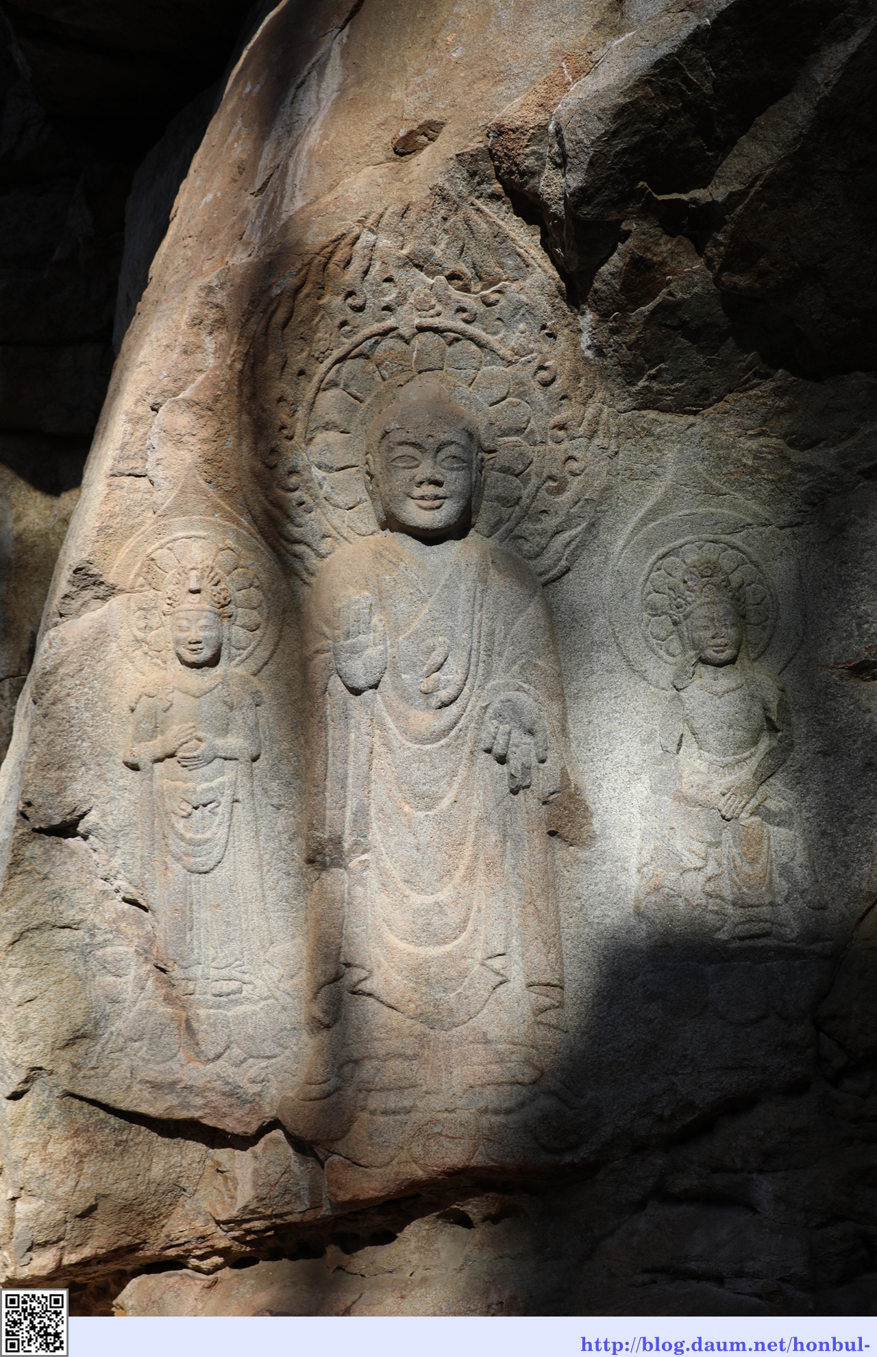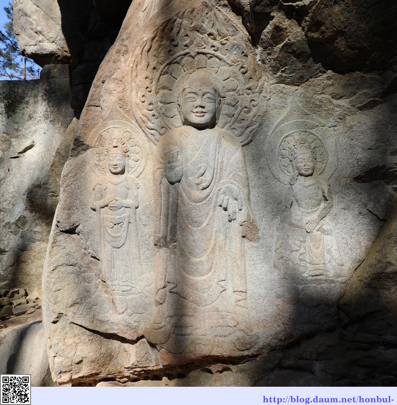 나무 그림자가 본존불과 우협시 보살입상 사이로 파고든다.