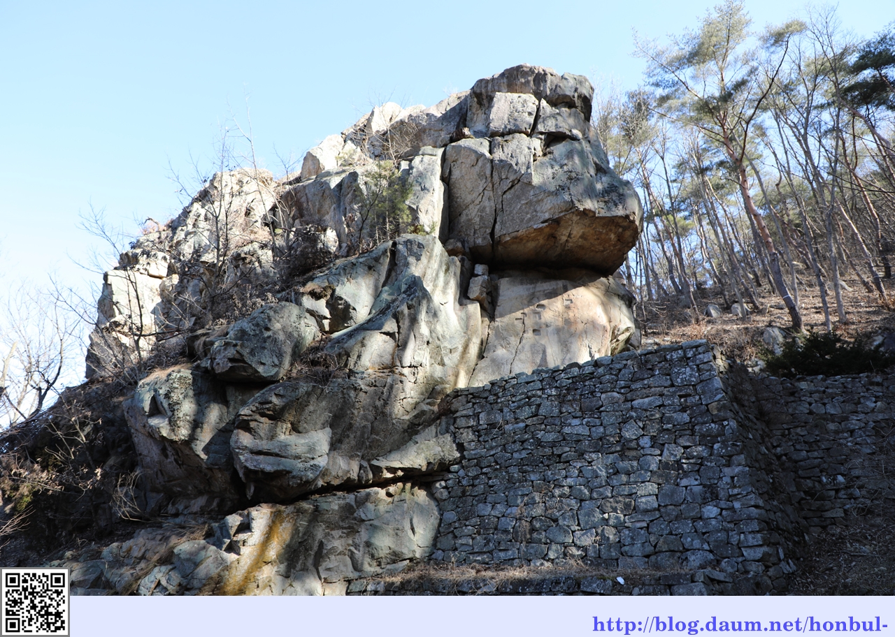 아래 정면에 보이는 바위의 홈의 전에 보호각을 세울 때 기둥을 박은 자리다.