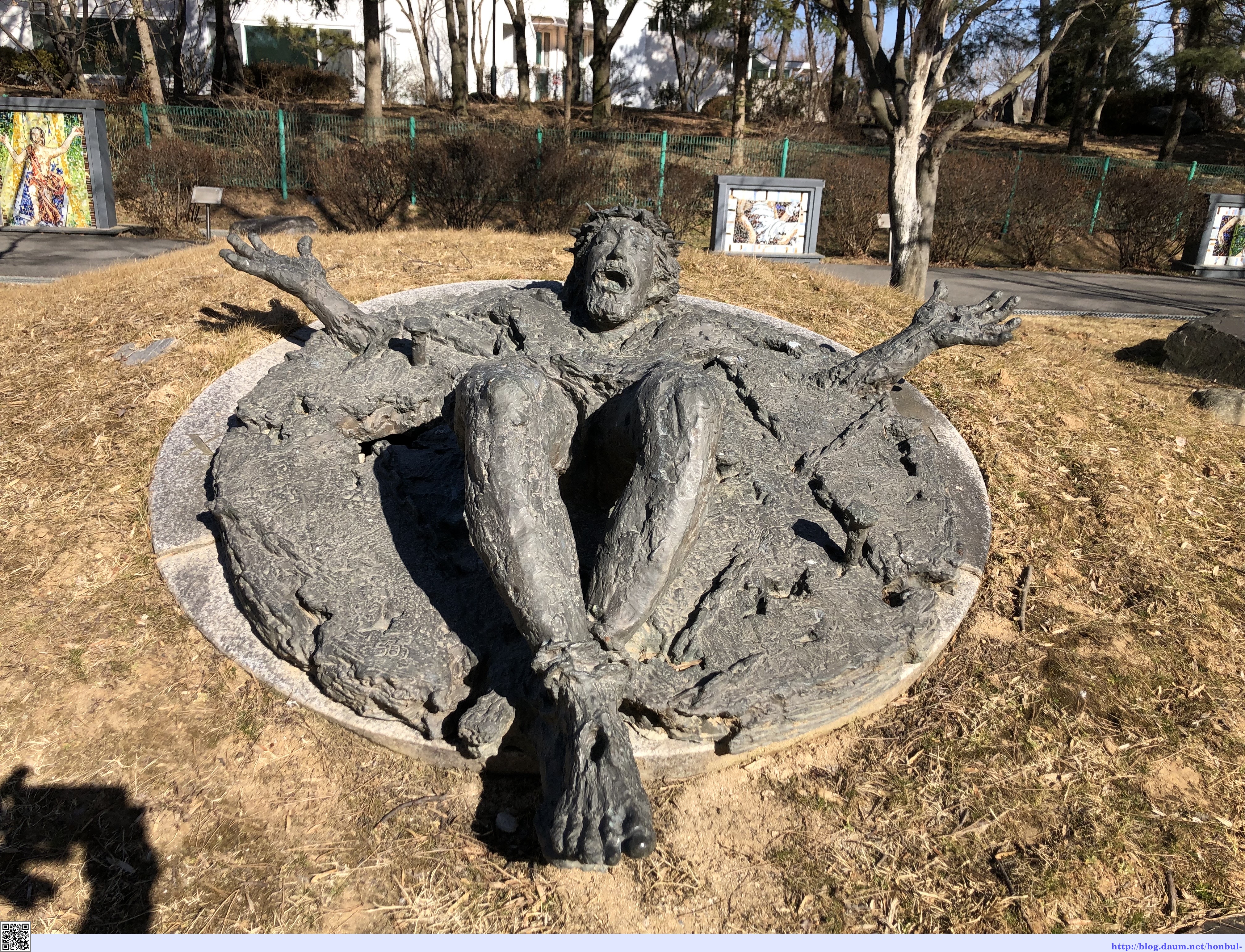 브론조로 인체 크기로 새로 설치한 환조 형태의 십자가의 길(김종필 작가 2012년 설치)이 있어