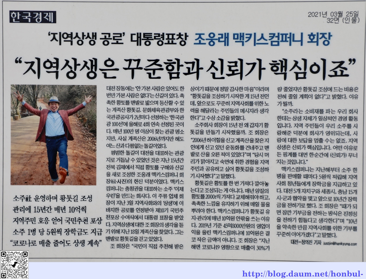 충청권 대표 소주 '이제 우린'의 기업 맥키스컴퍼니 조웅래 회장이 조성한 '계족산 황톳길'은