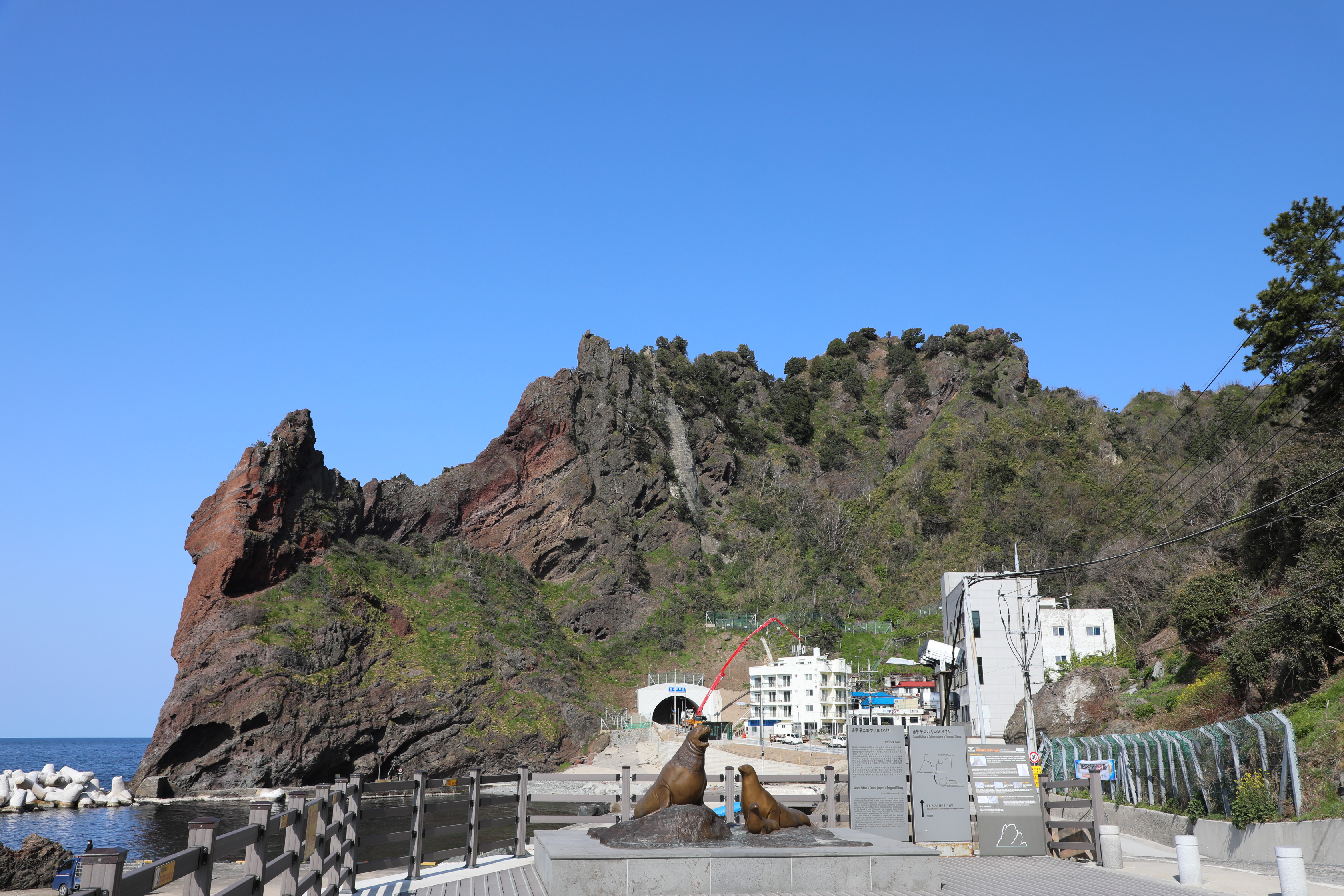 다시 돌아오기를 기원하는 강치 동상이 거북바위와 함께 보인다.