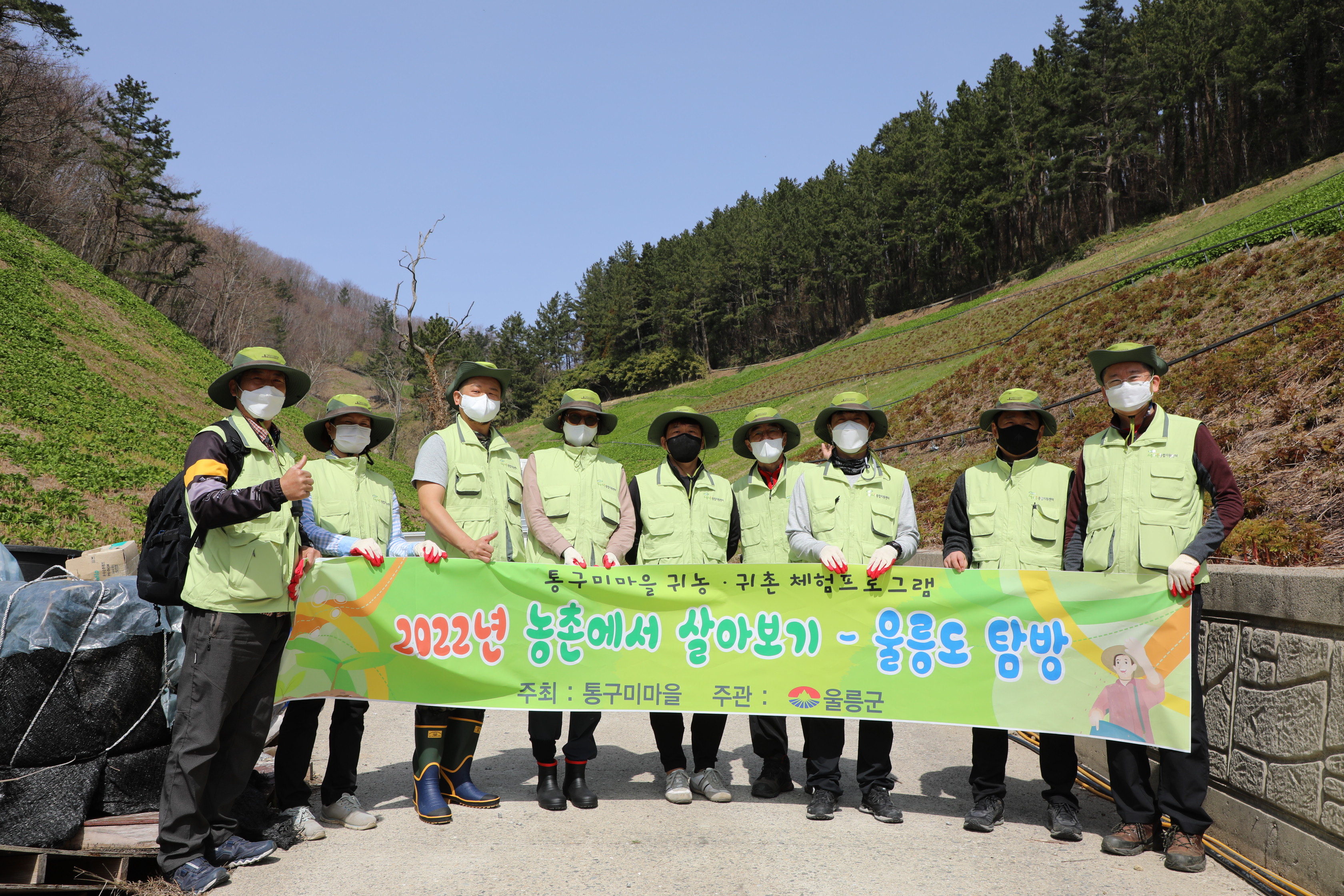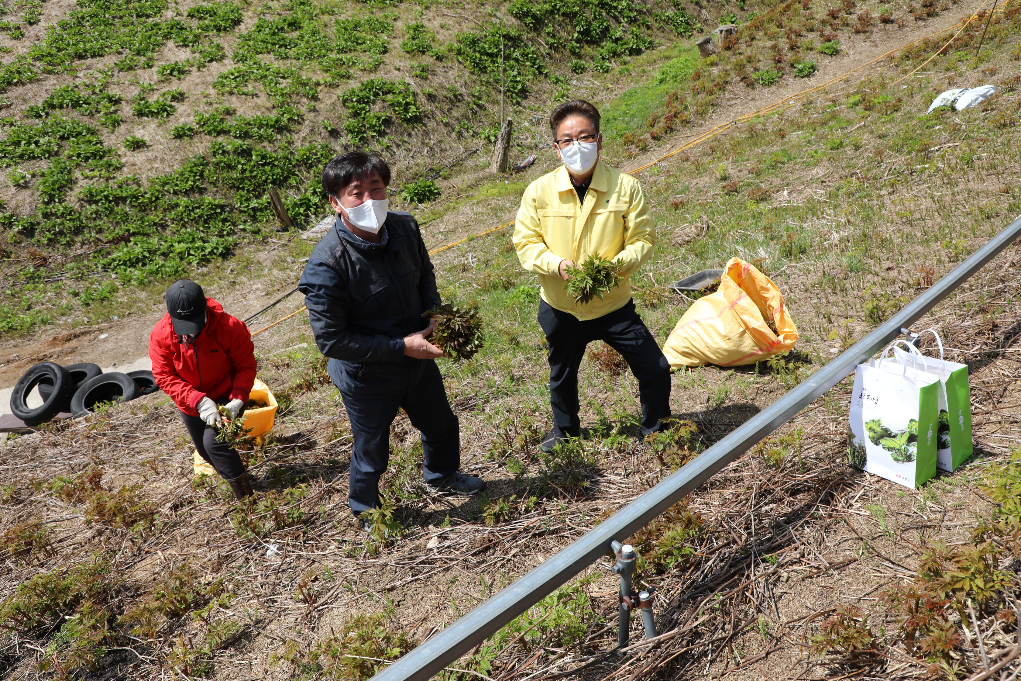 한창 일하고 있는데, 울릉도 군수 님이 울릉군농업기술센터 기술보급과장 님과 함께 오셔서 일손을 거들기도 하신다.
