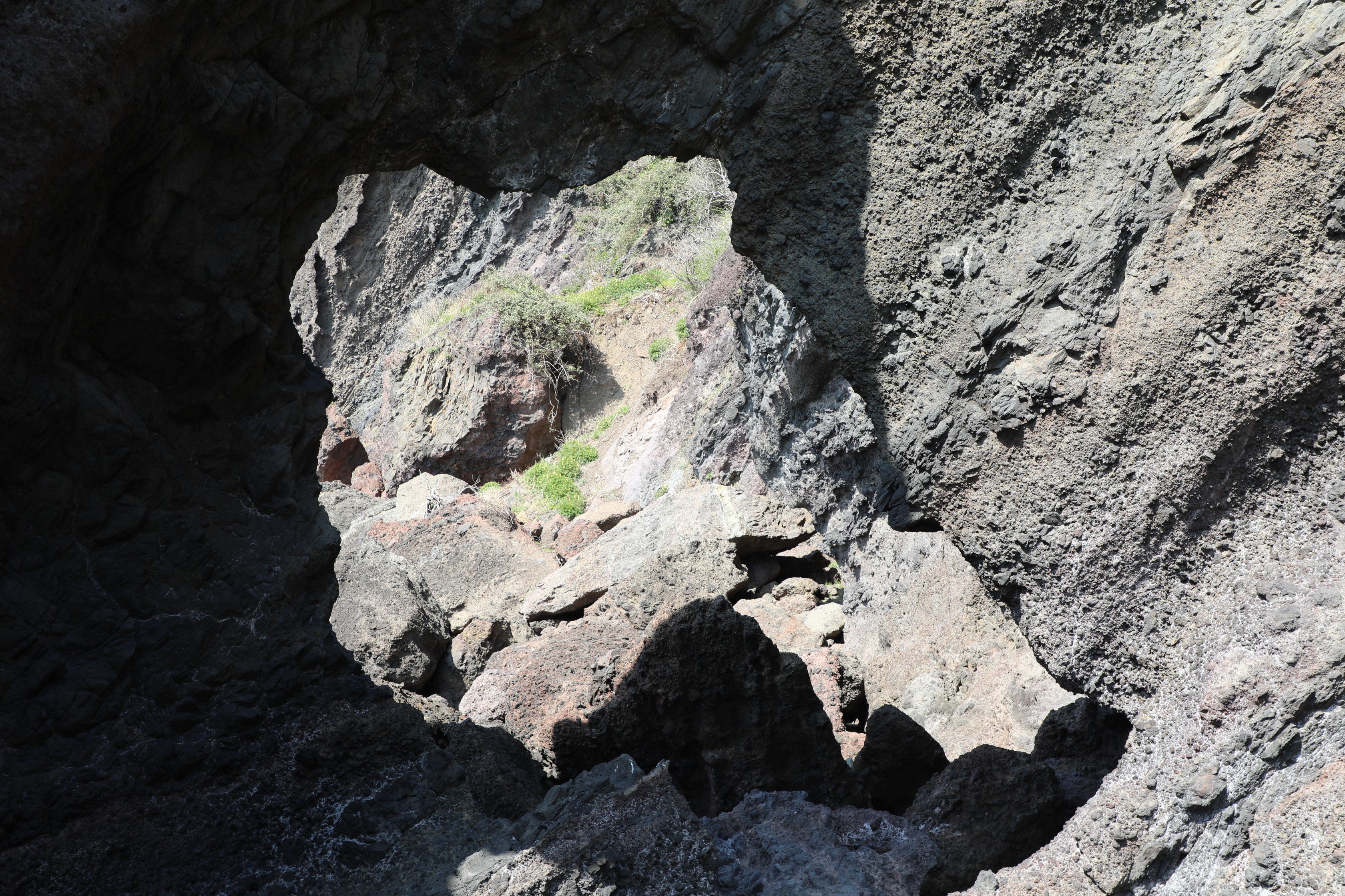거대한 바위에 제법 큰 굴이 뚫려 건너편으로 넘어갈 수 있으나 발아래는 바닷물이 가득 찼다.