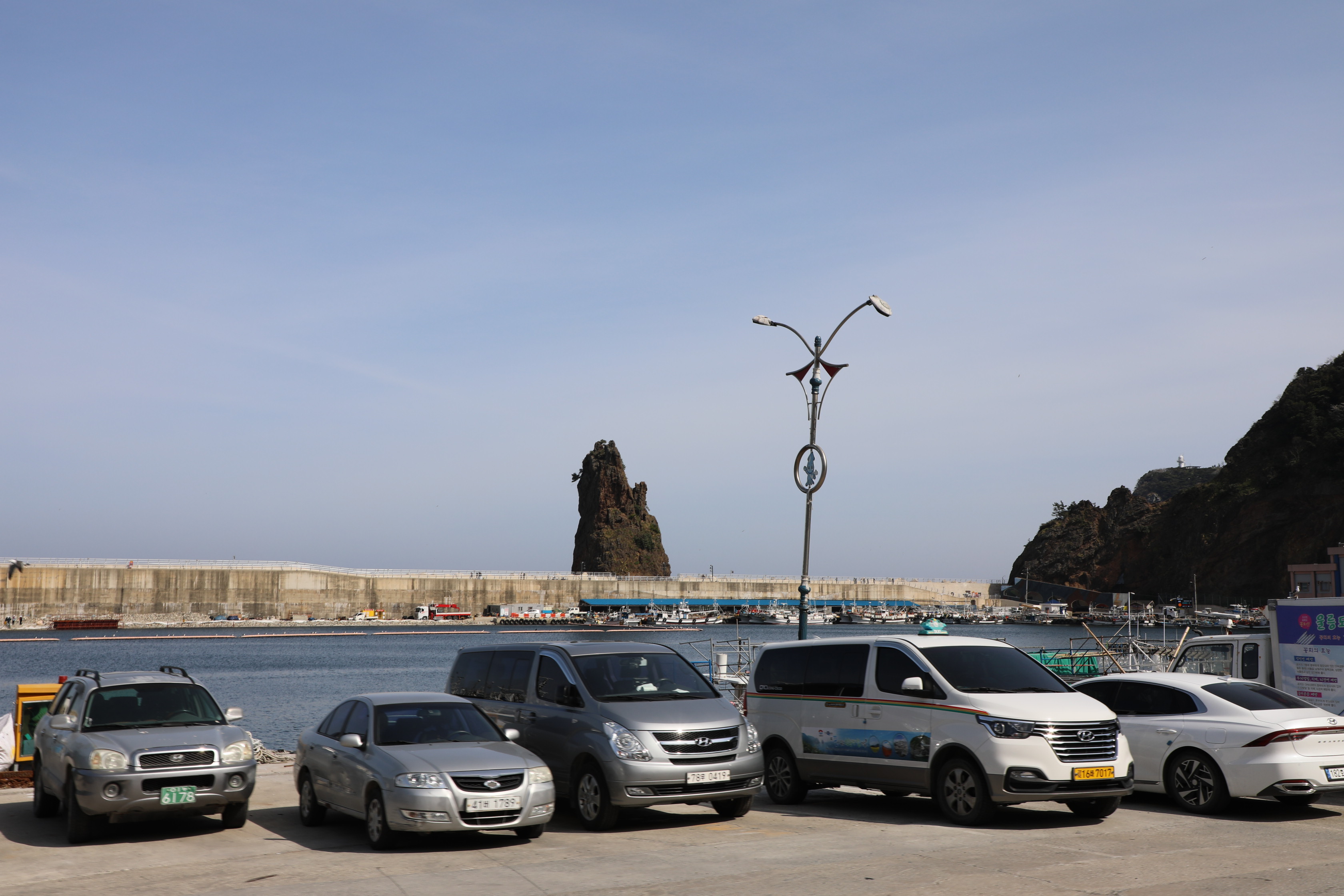 하산길에 차창 밖으로 보이는 도동항과 방파제에 얹힌 촛대바위