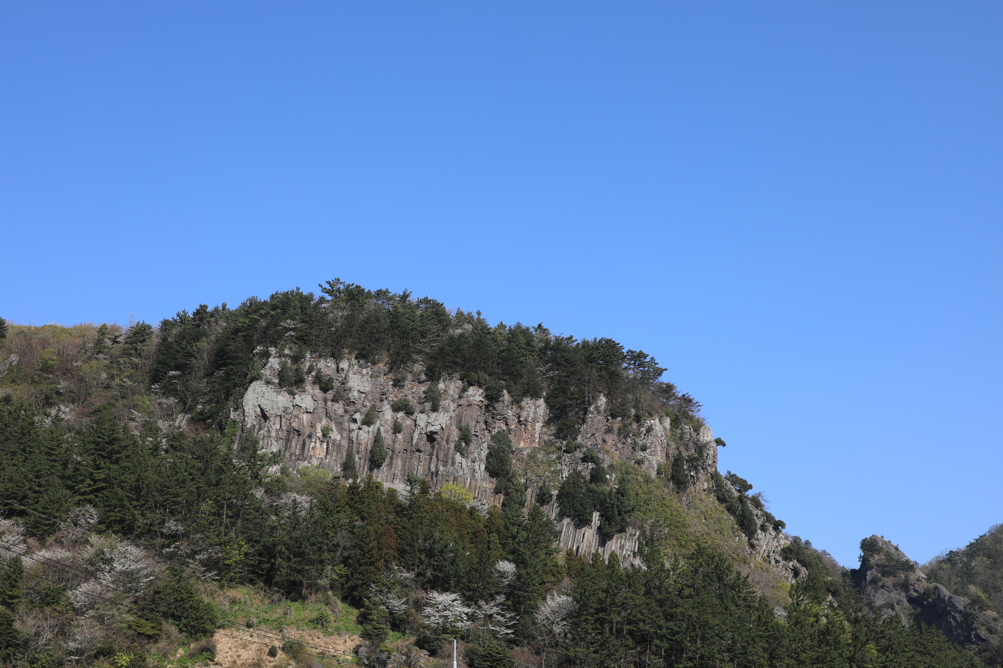 바위의 벽면에는 수많은 주상절 리가 발달해 있는데 특히 동쪽부에서 관찰할 수 있는 하늘로 곧게 뻗은 주상절리가