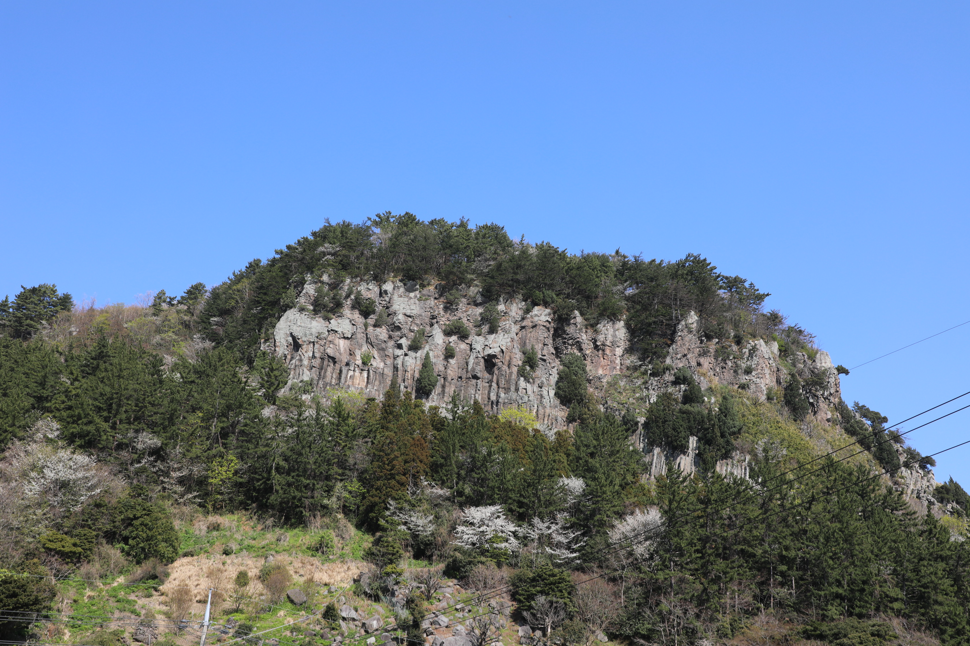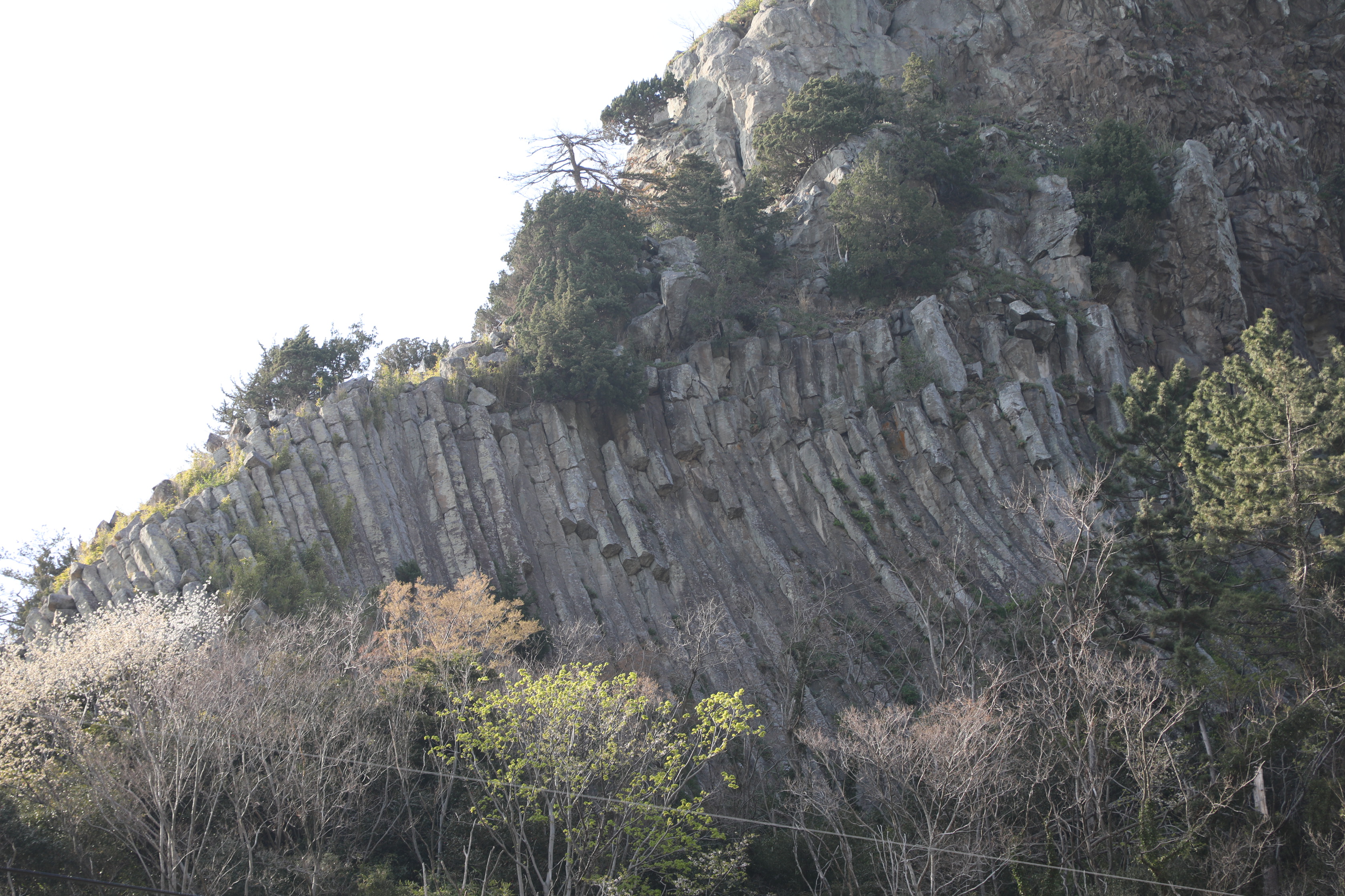 바위의 벽면에는 수많은 주상절 리가 발달해 있는데 특히 동쪽부에서 관찰할 수 있는 하늘로 곧게 뻗은 주상절리가
