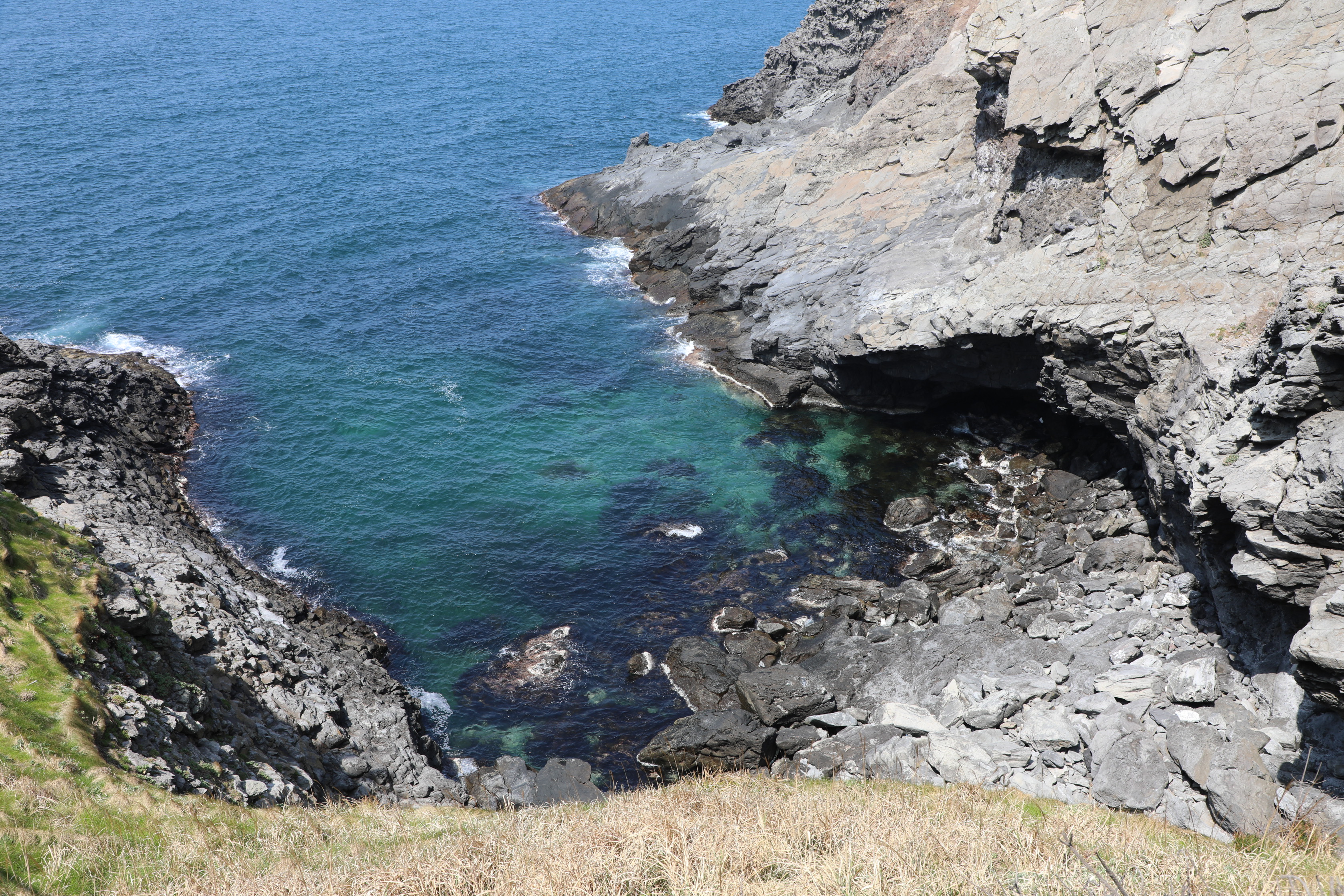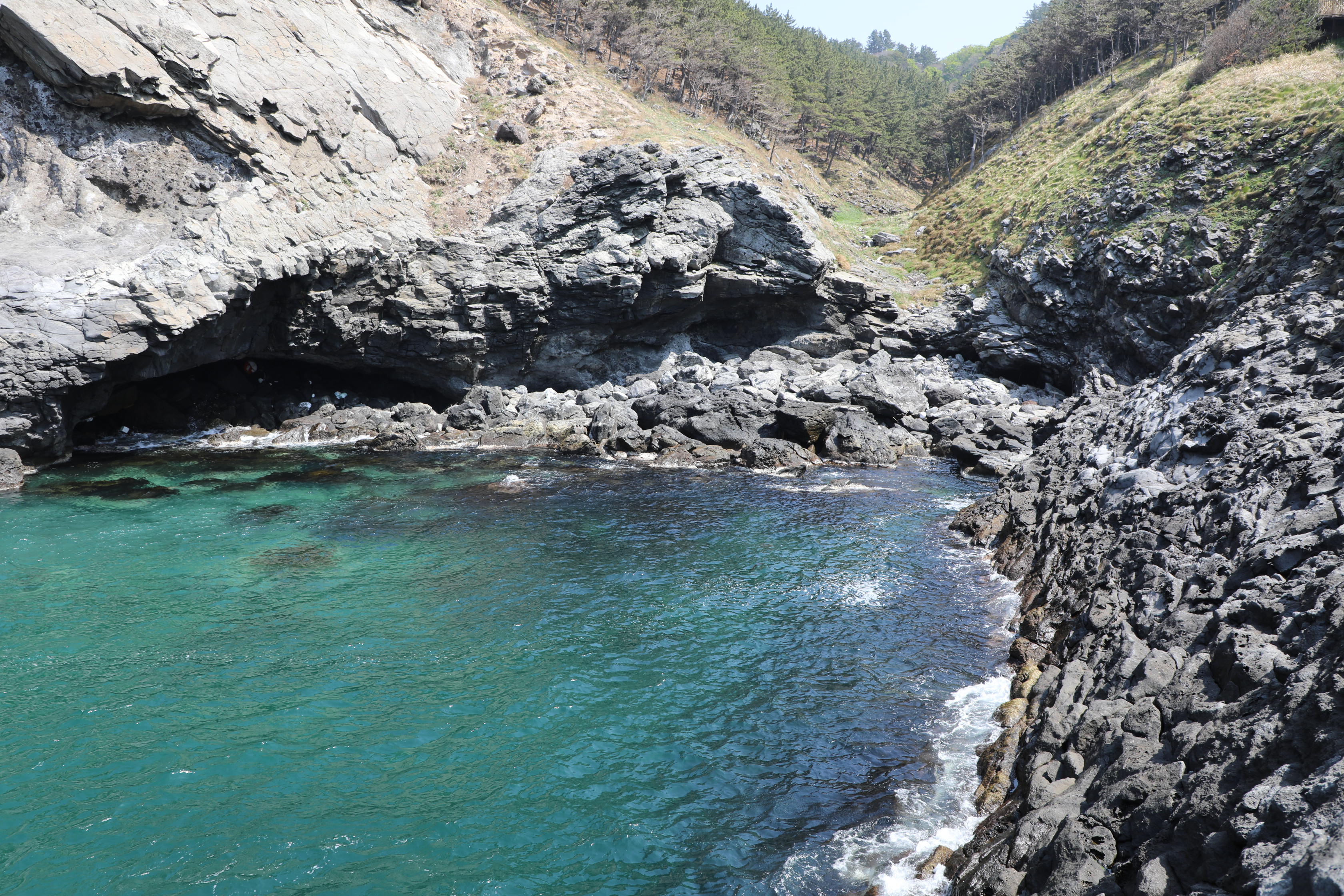 절리가 균일하지 않게 분포하는 조면암이 파도에 침식되어 해식동굴이 형성되었다.