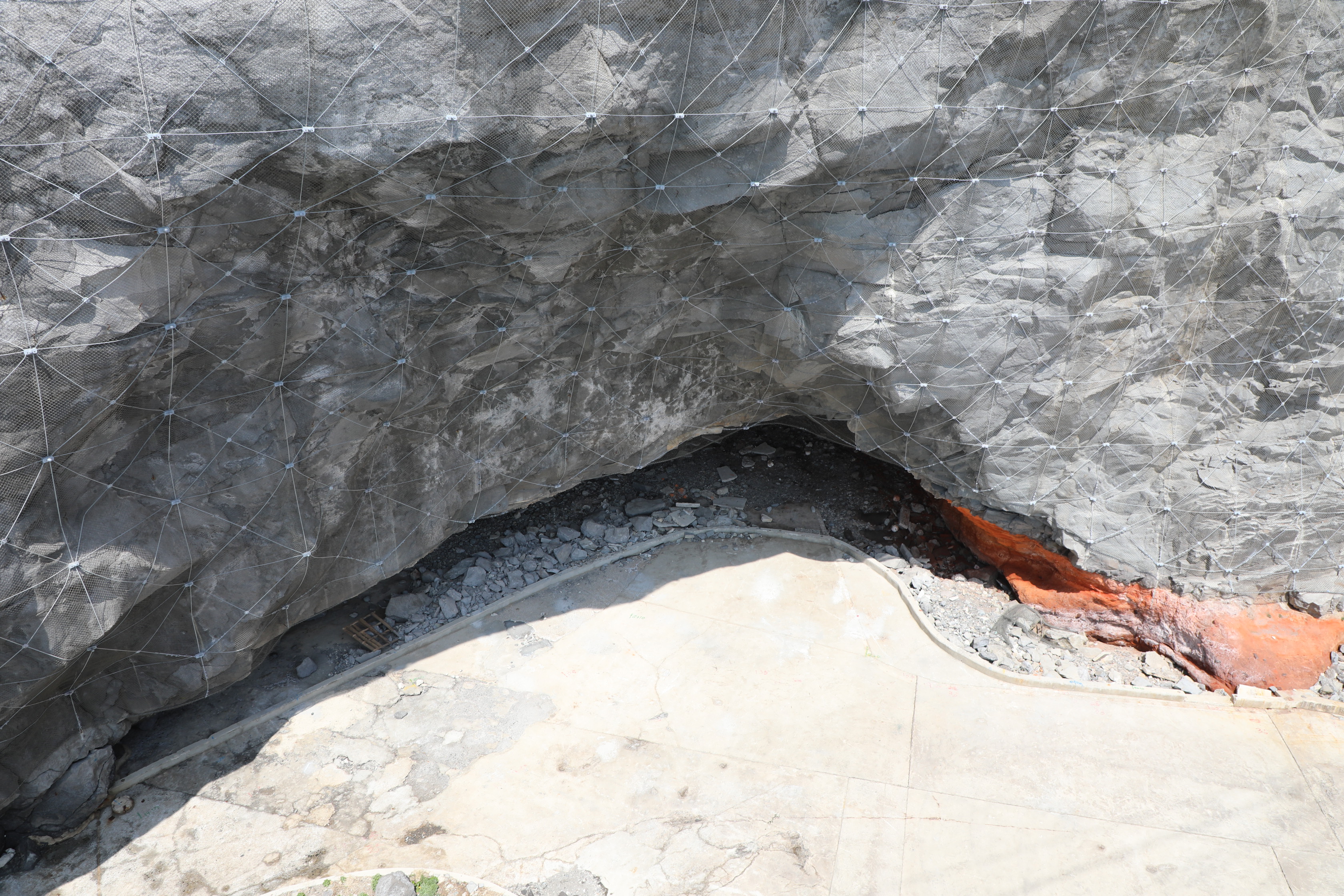 절리가 발달한 상부는 침식을 적게 받고, 절리가 조밀한 하부는 침식을 많이 받으면서 동굴이 만들어졌다. (안내문)