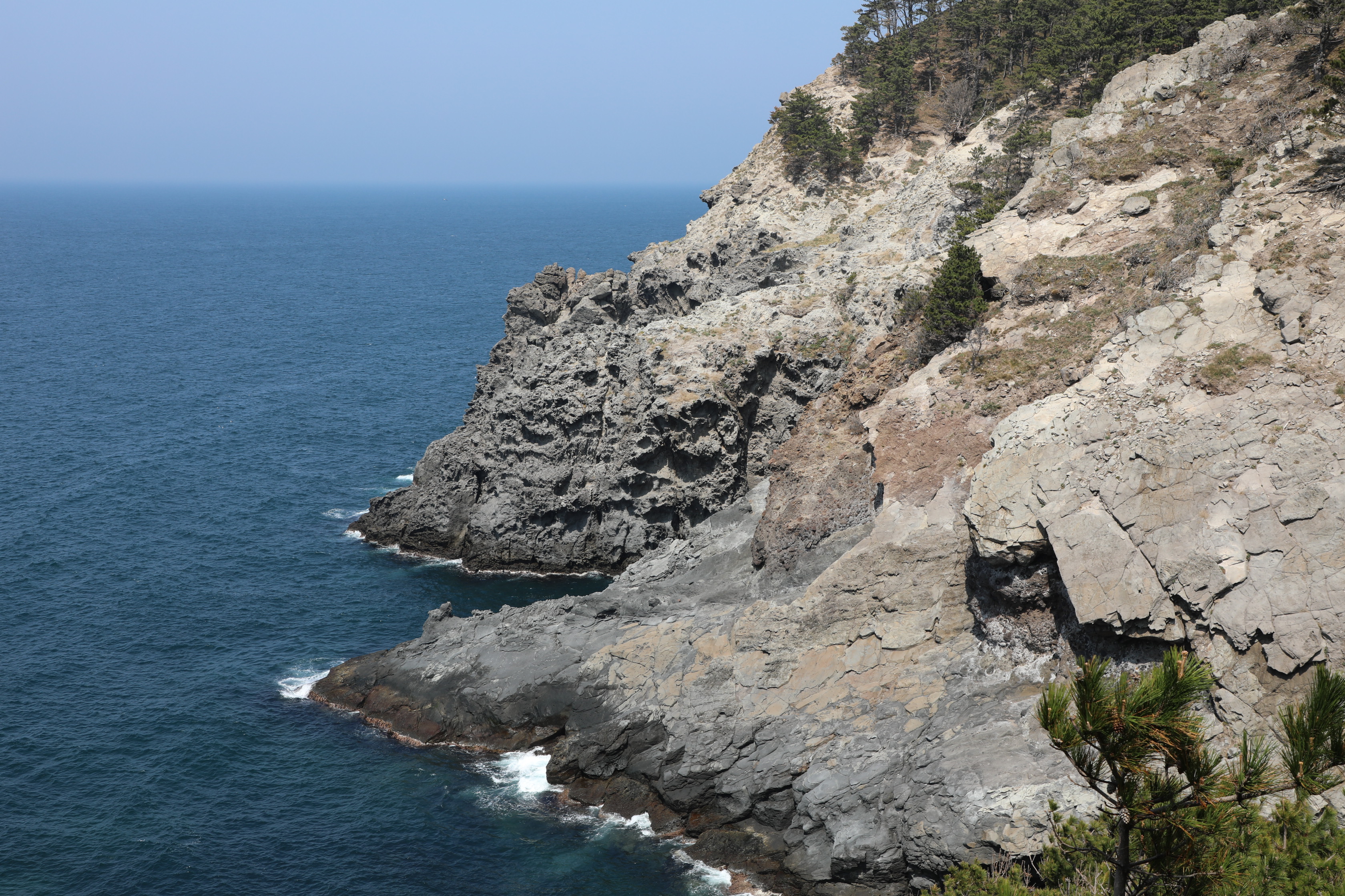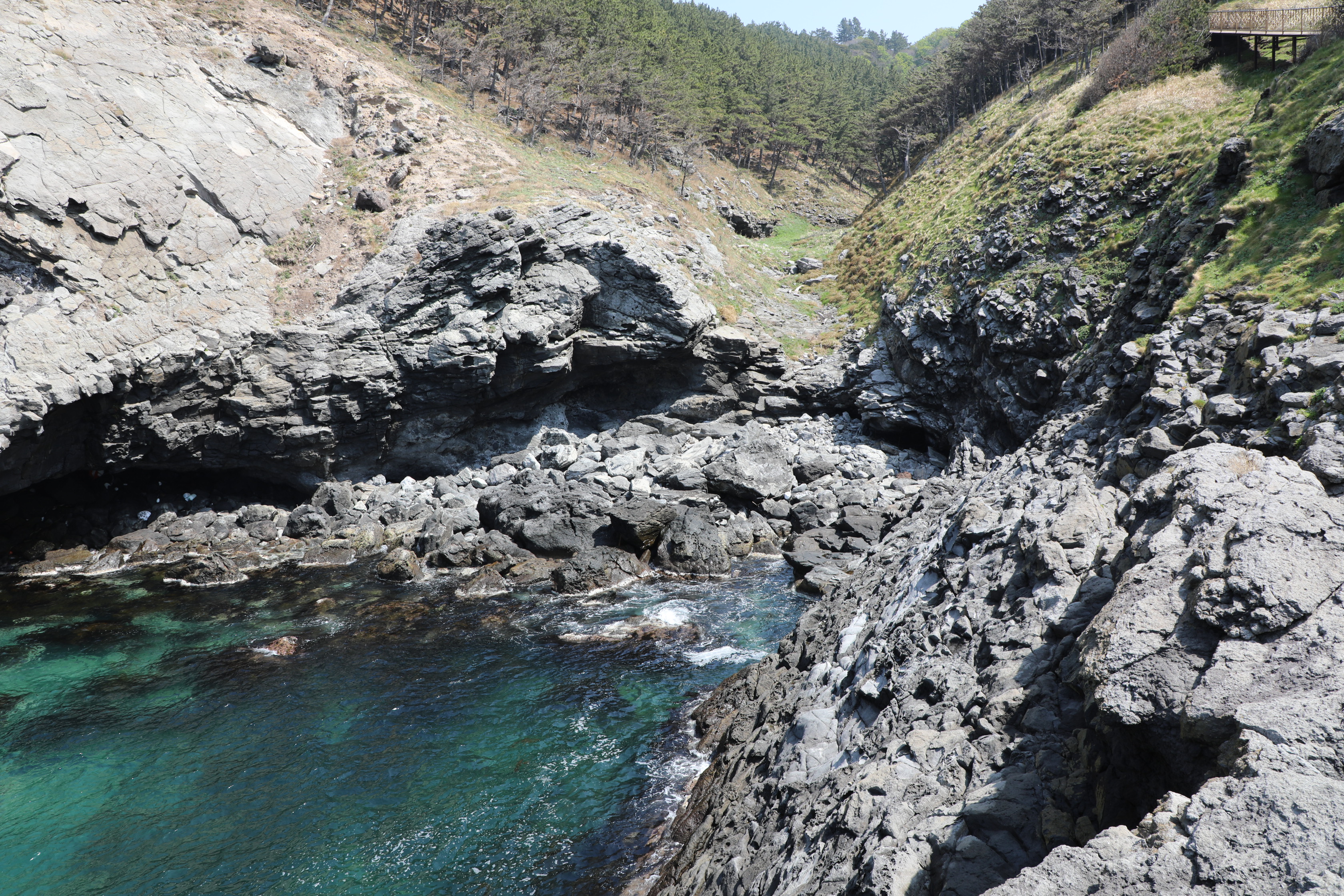 오랜 시간에 걸쳐 이런 접촉부에 차별 침식이 일어나 육지 쪽으로 들어간 침식 해안이 만들어졌다. (안내문)