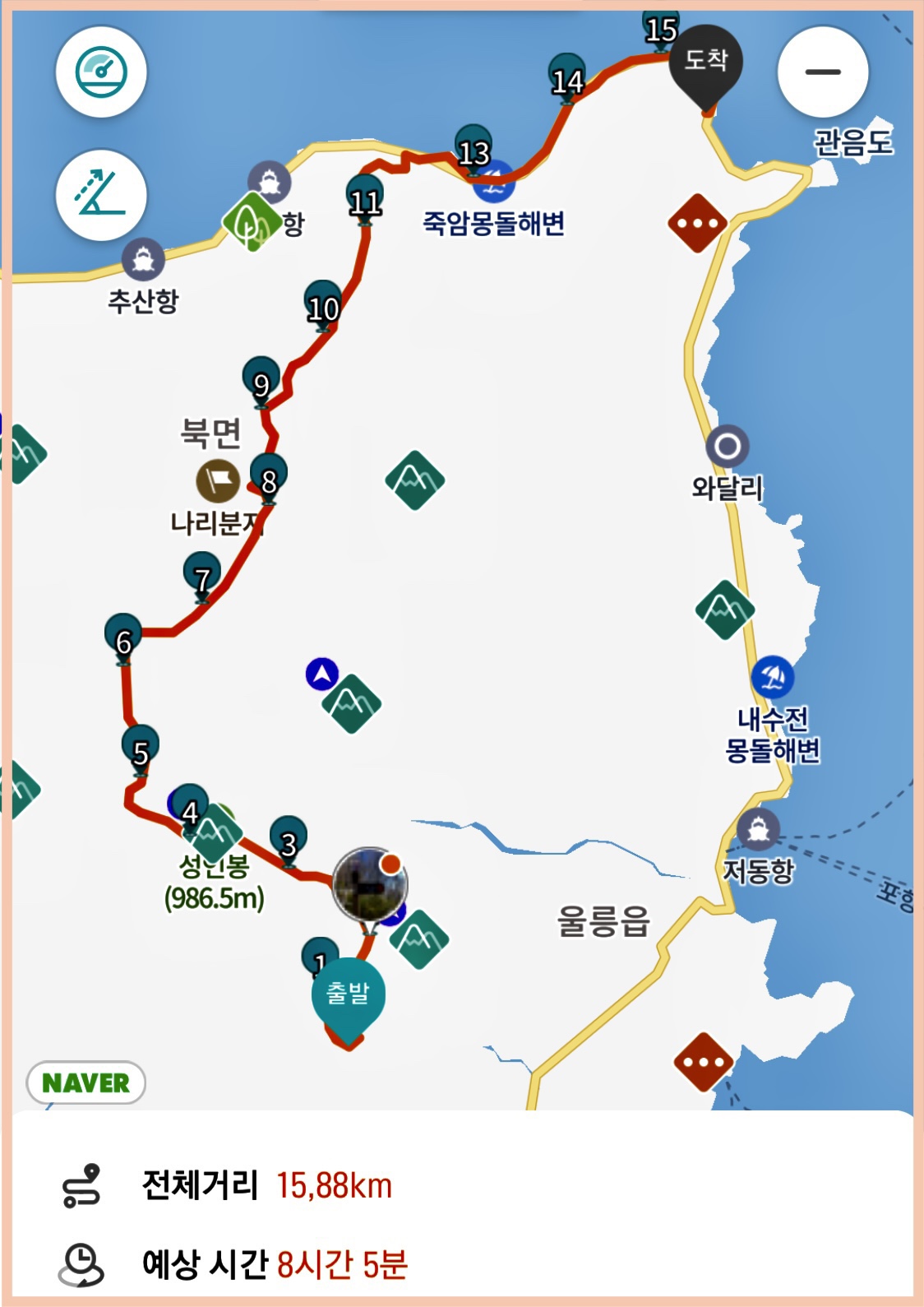 2022_69 2022.4.30 (토) 08:13~13:42(5시간 30분 산행, 30분 휴식, 봉래폭포 탐방시간 포함) 다소 흐림 사실상 울릉도 생활도 이젠 거의 종점으로 치닿는다. 5월 3일 화요일 오후 한 시 삼십 분 배를 타면 되