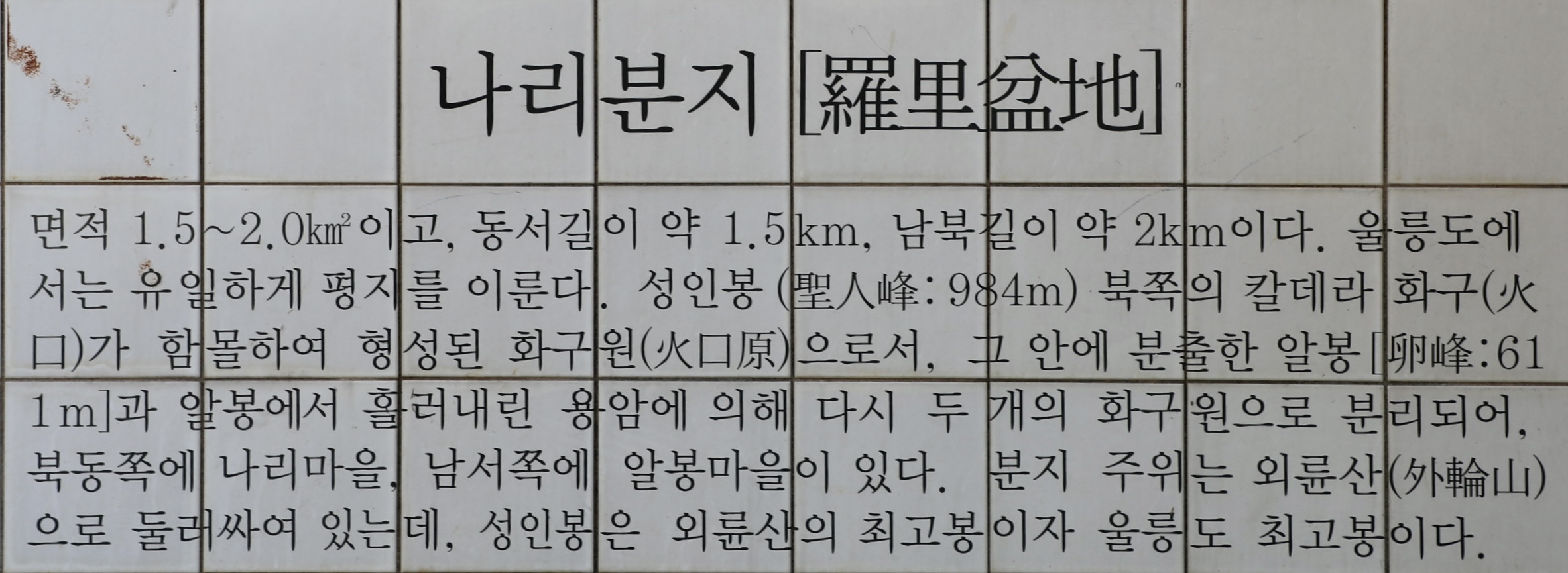 성인봉은 산정에 화구가 따로 없는 외륜산으로 북쪽에 3각형 모양의 거대한 칼데라인 나리분지가 있고,