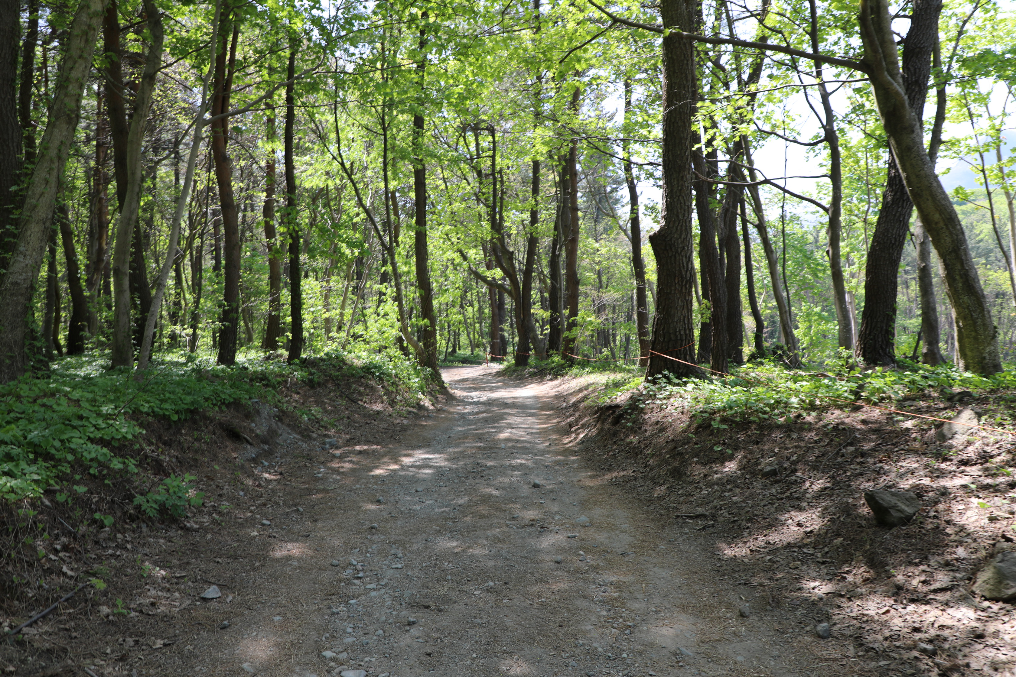 나리분지 숲길은 싱그러운 연둣빛으로 물들고 자연스러운 흙길이라 걷기 좋은 코스다.