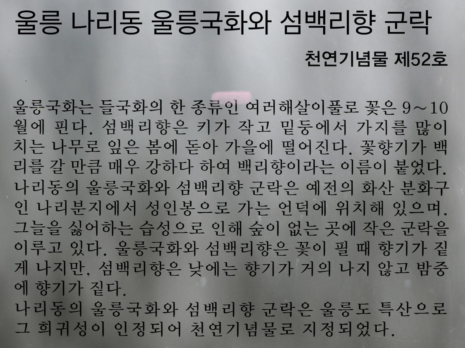 성인봉 원시림에 서식 중인 다양한 식생이 산재해 있어 울릉도의 역사와 자연을 함께 느낄 수 있다.