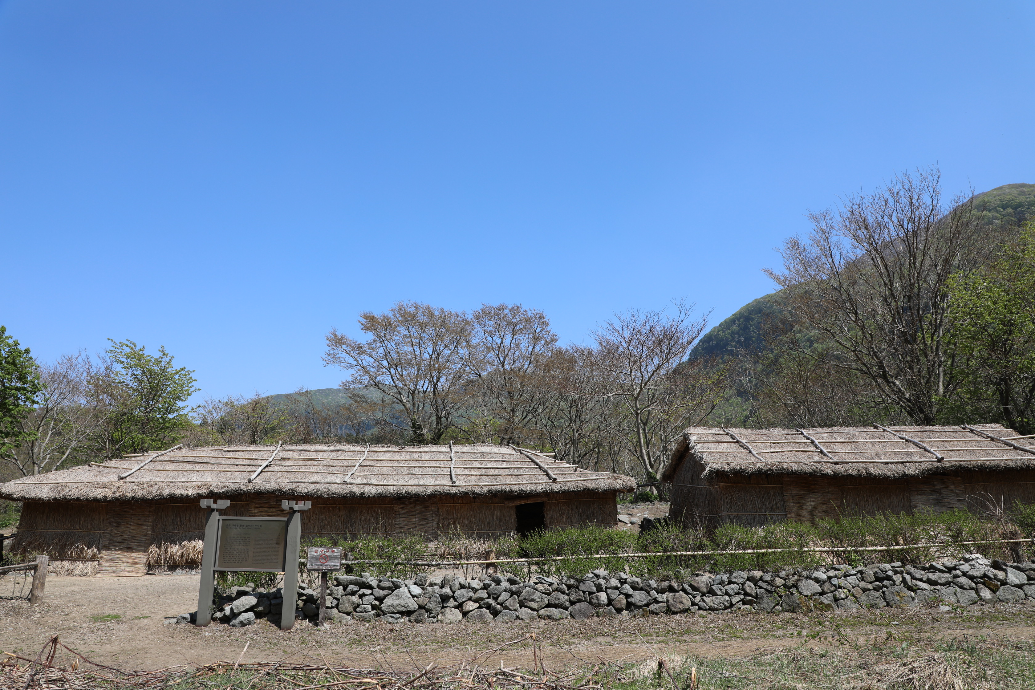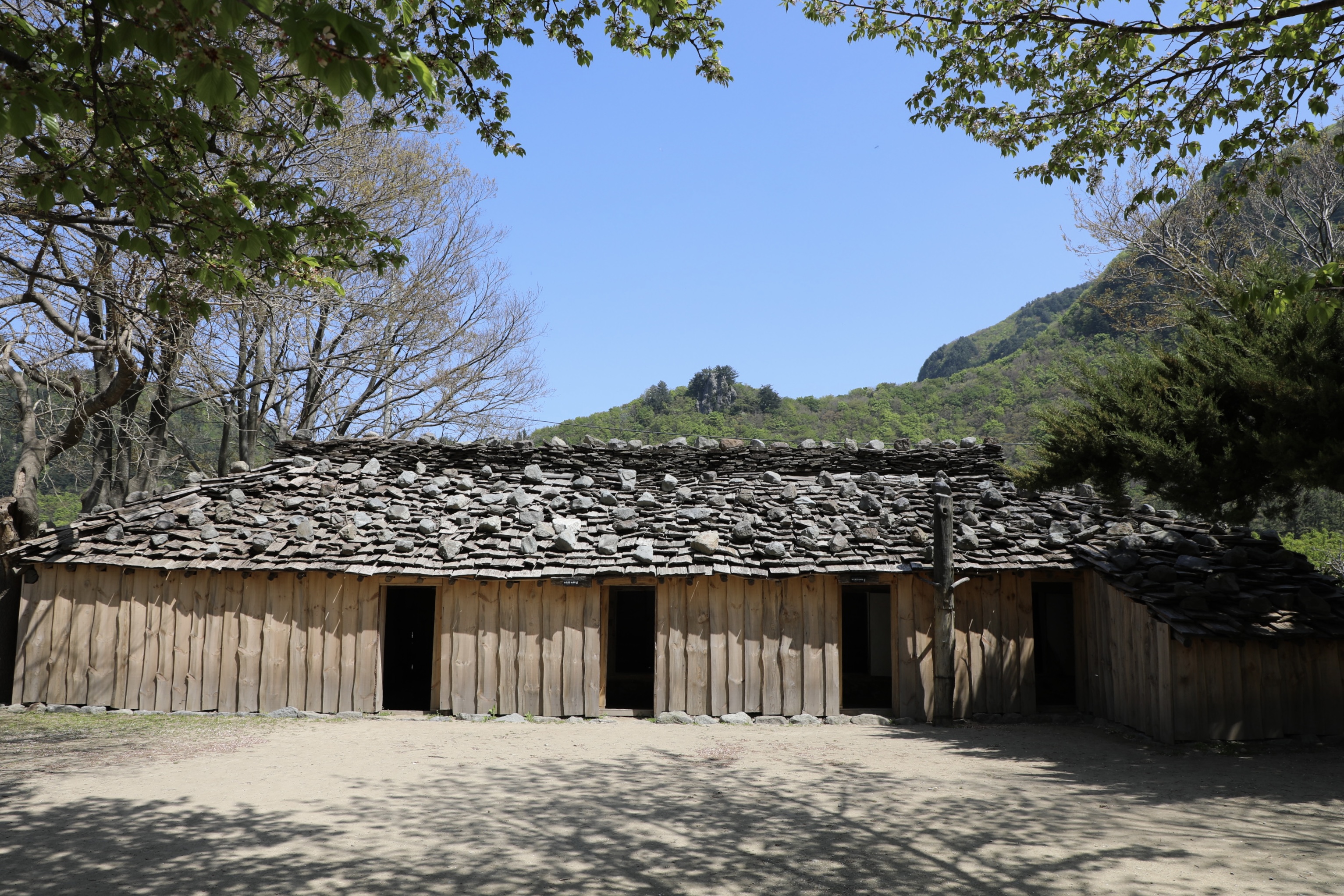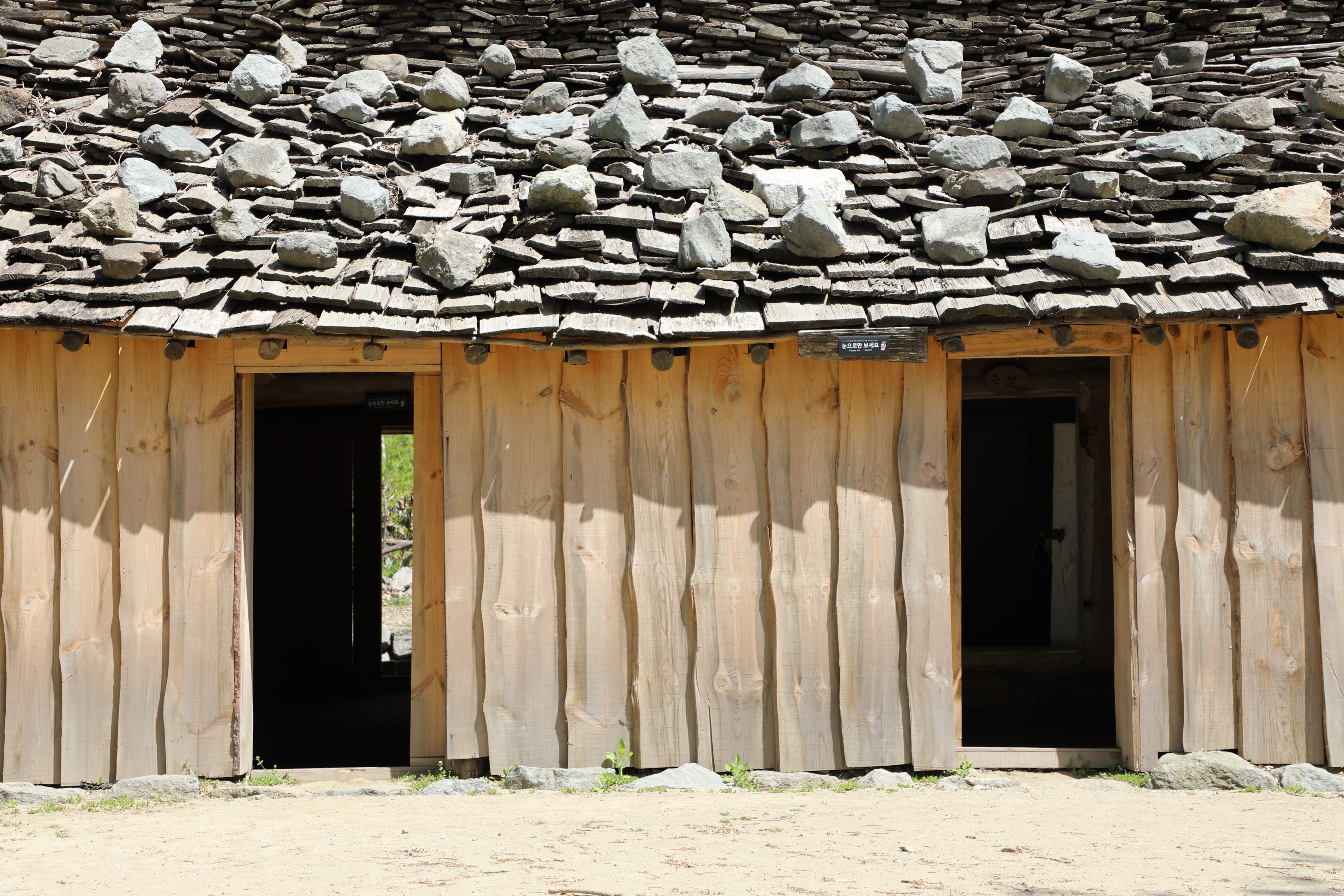 나무를 세로로 도끼질한 널빤지로 지붕을 만들고 바람에 날리지 않게 돌을 얹었다.