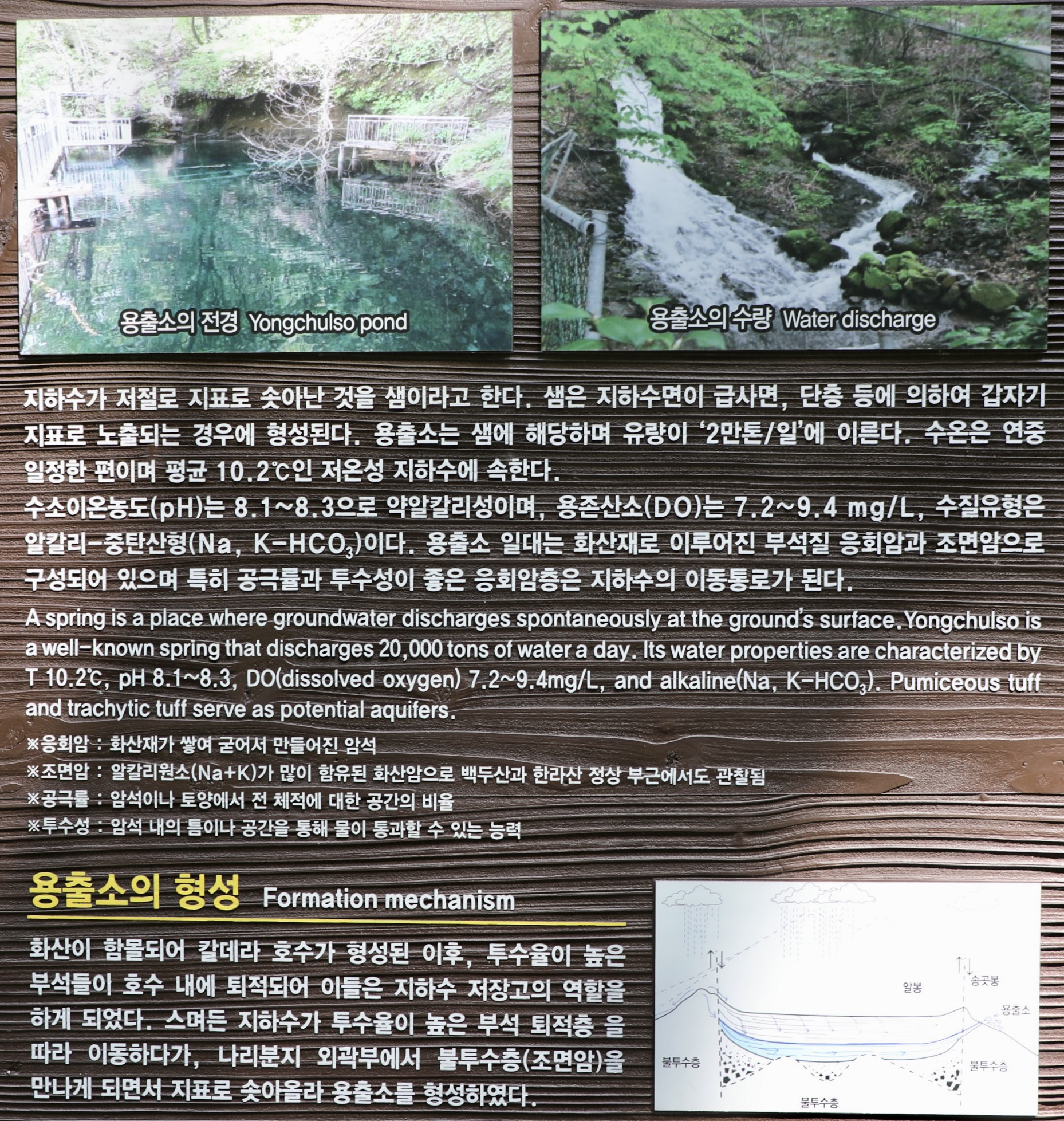 용출소 일대에는 공극이 많은 부석질 응회암과 불투수층인 조면암 층으로 구성되어 있는데,