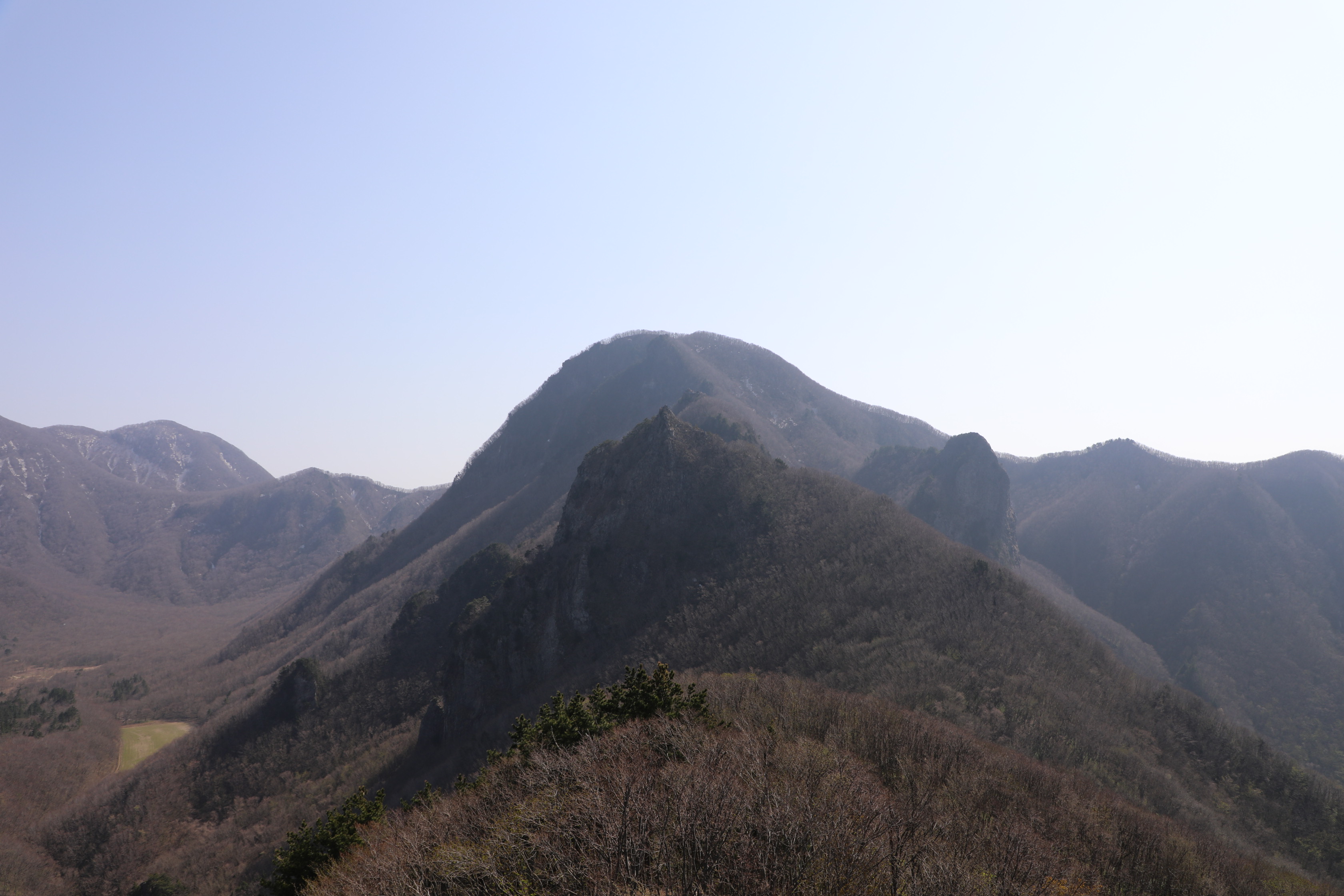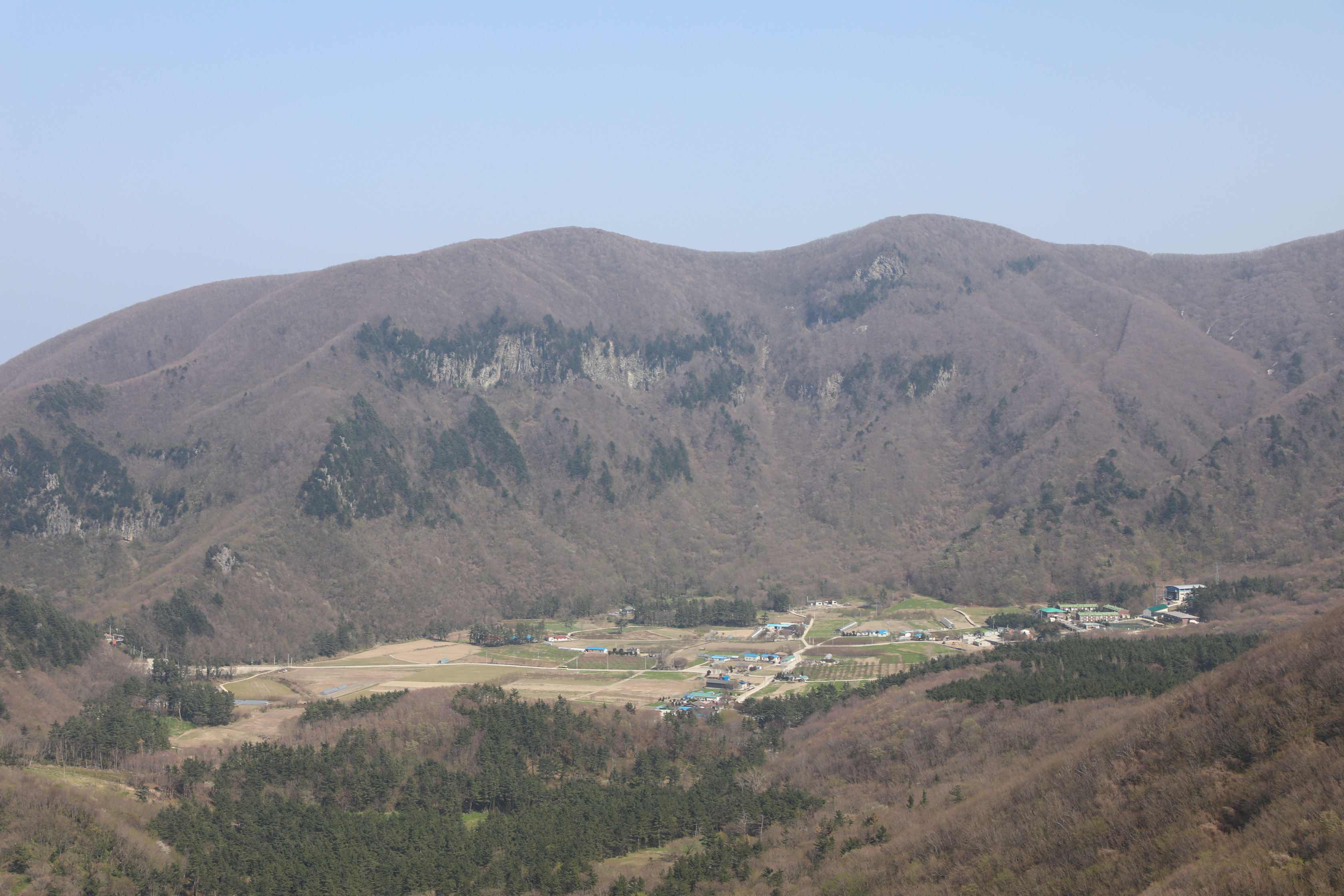 높은 봉우리는 미륵산, 우측으로 살짝 비켜난 봉우리는 옥녀봉이다.