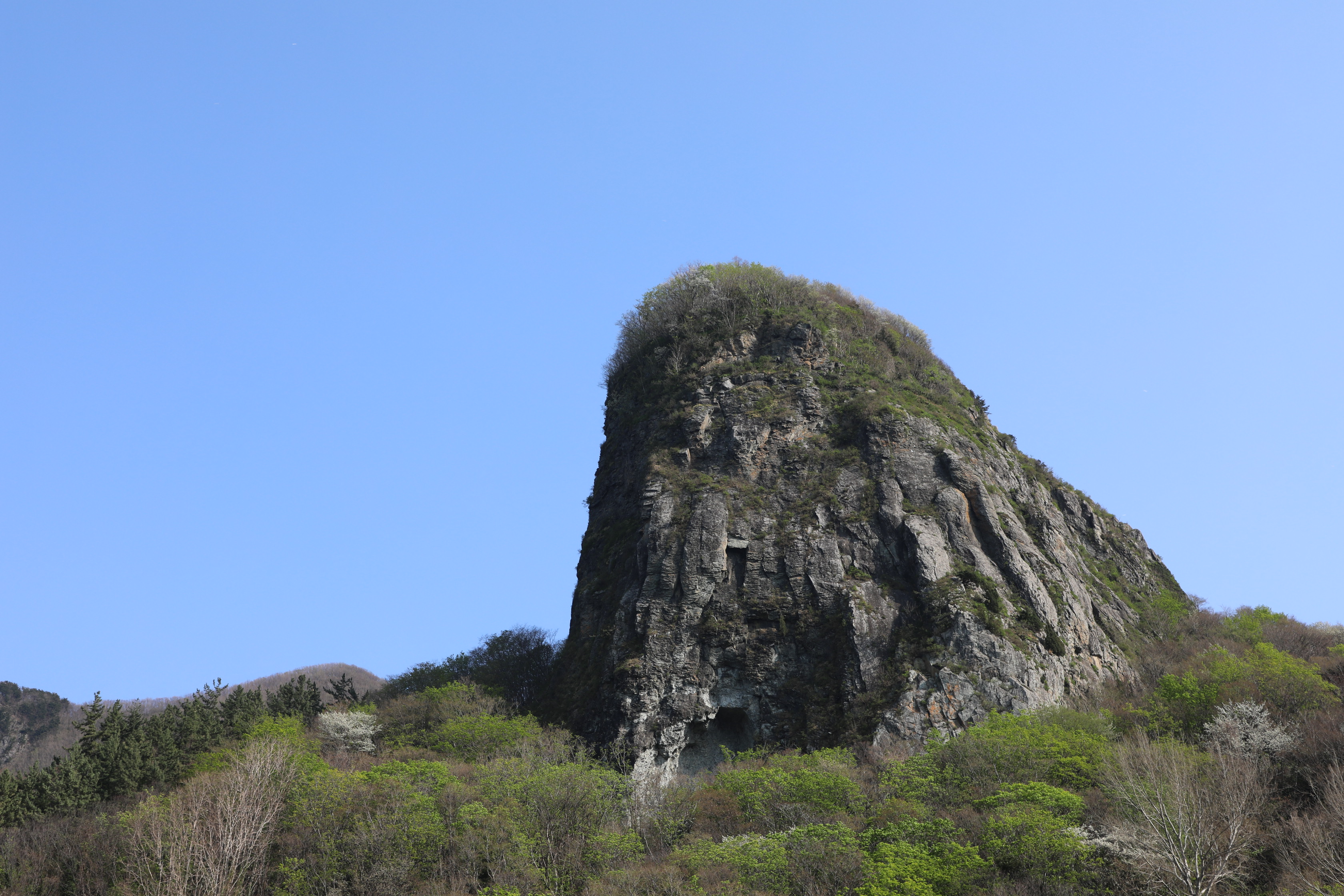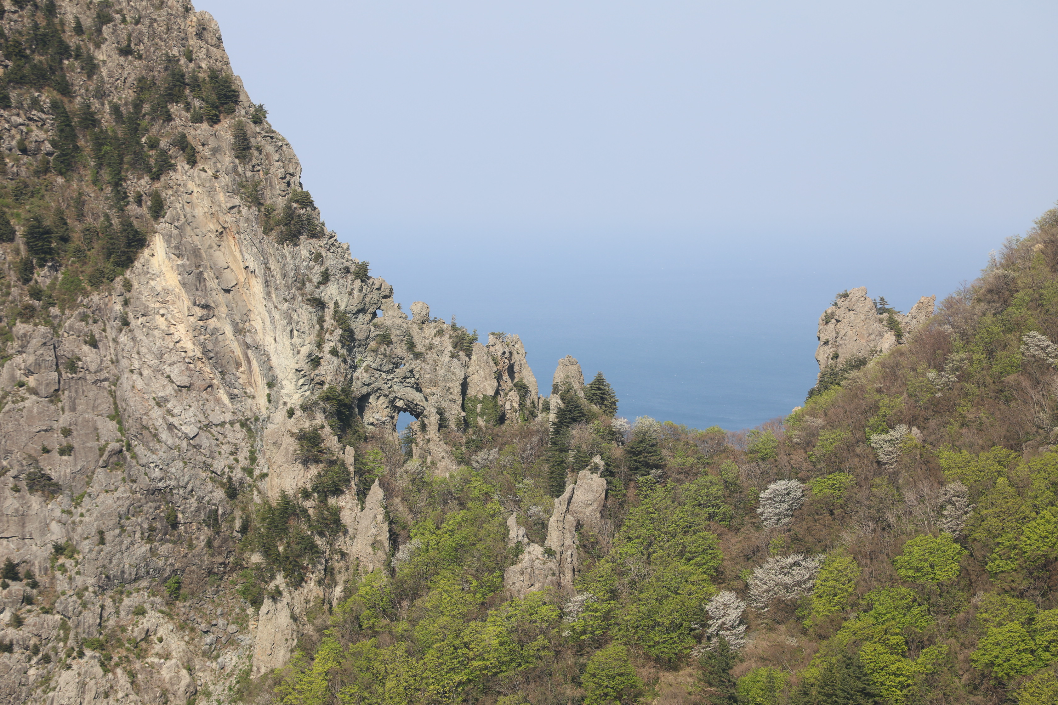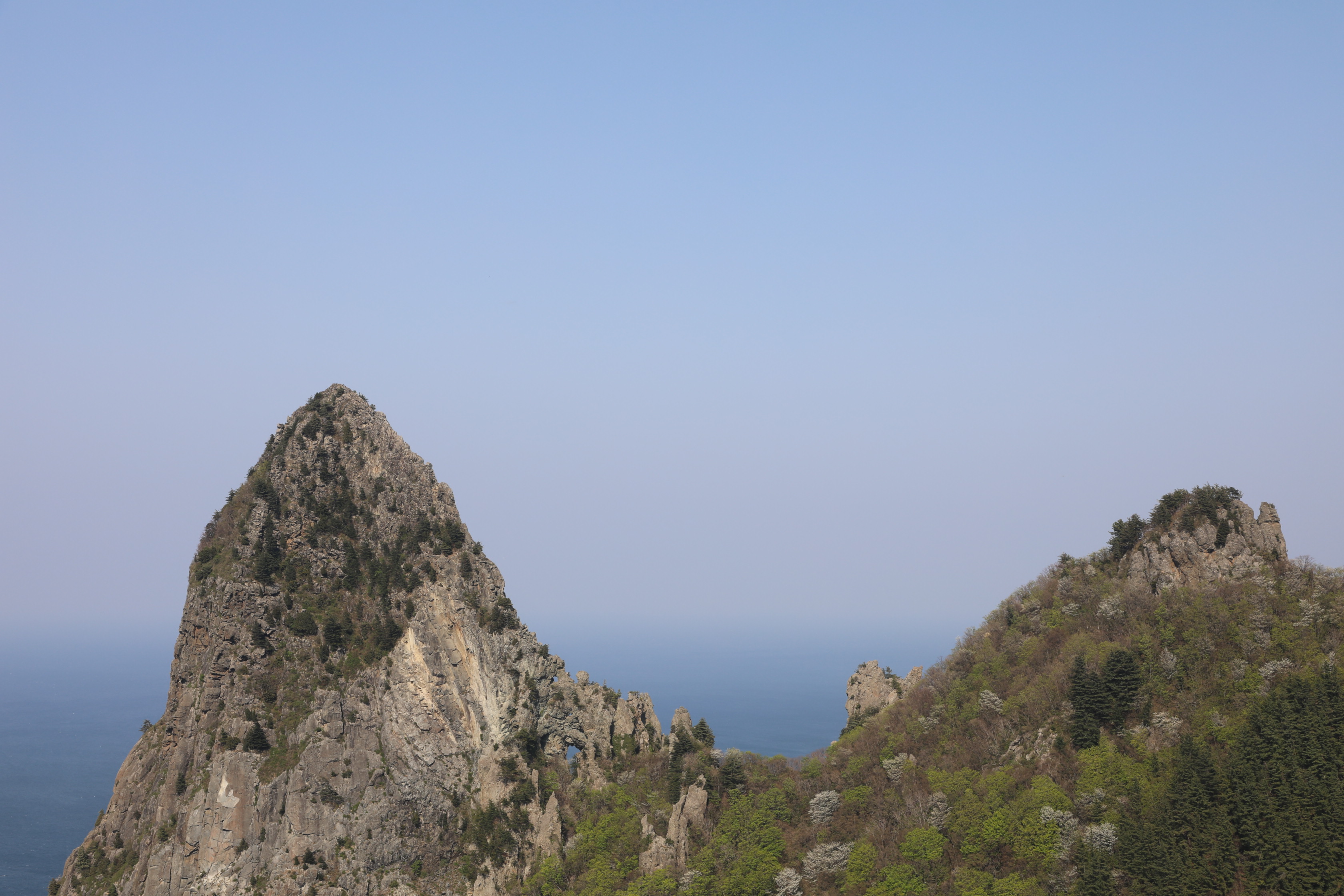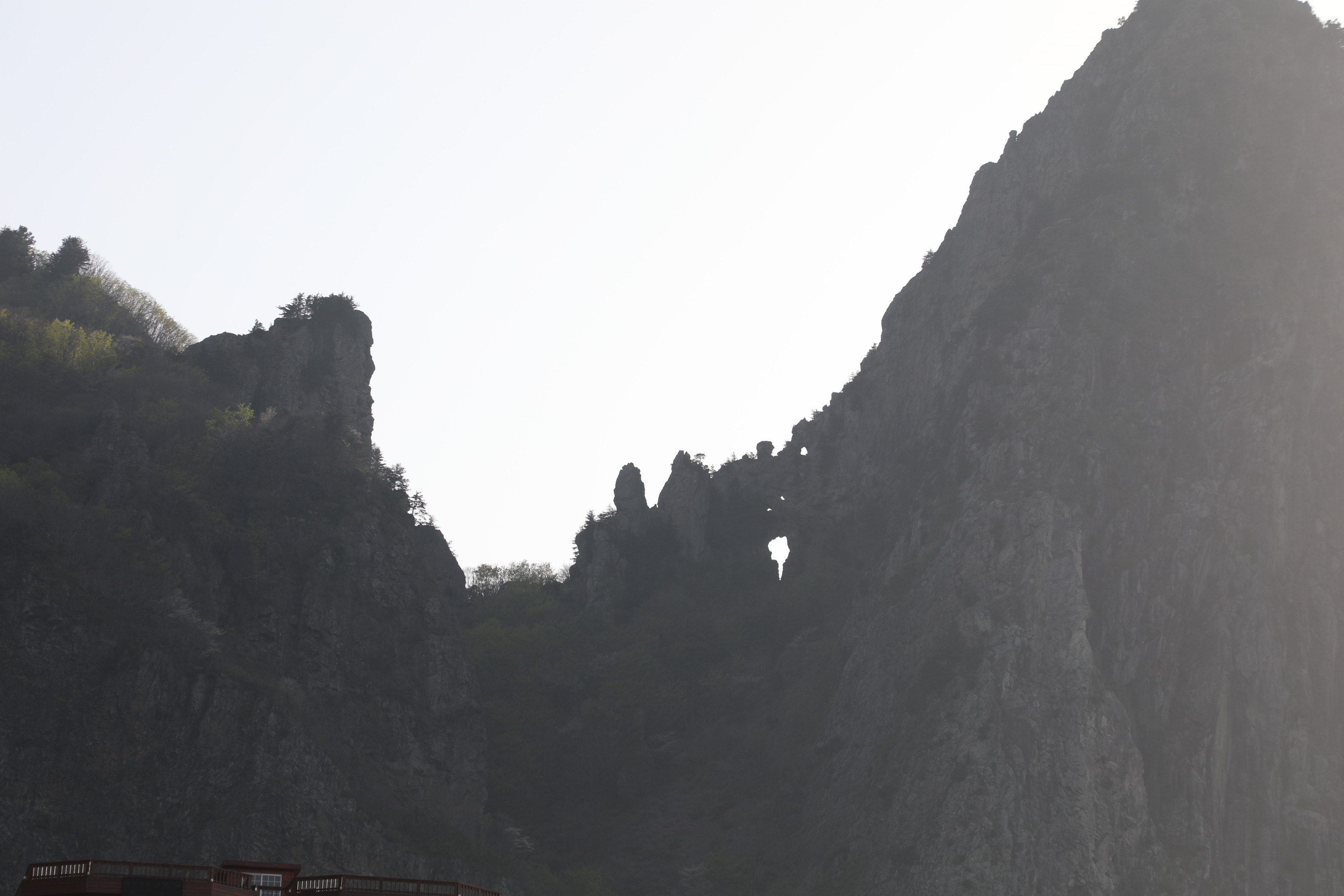 석봉 전망대에서 볼 때 송곳봉의 구멍은 두 개까지 봤으나 역광인 이곳에서는 4개가 보인다.