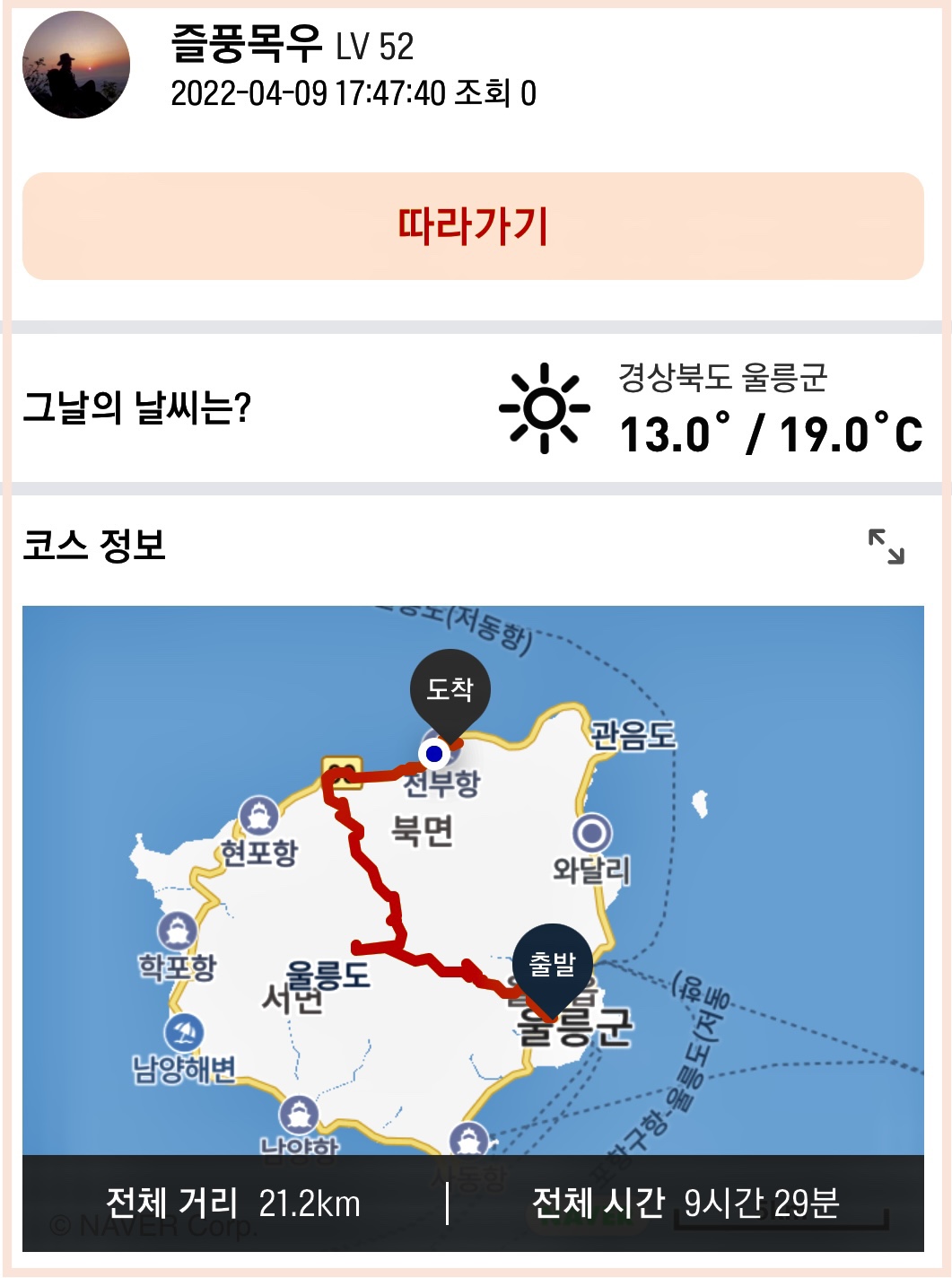 이렇게 울릉도 성인봉을 등산하는 김에 여러 곳을 들린 거리는 21km가 조금 넘는다.