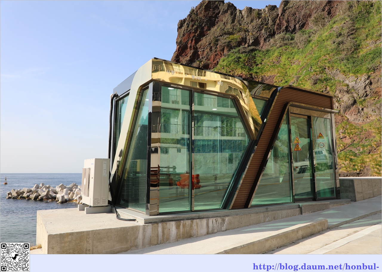 사방은 유리로 벽을 만들고 전동문을 달아 손으로 눌러야 열고 닫을 수 있다.
