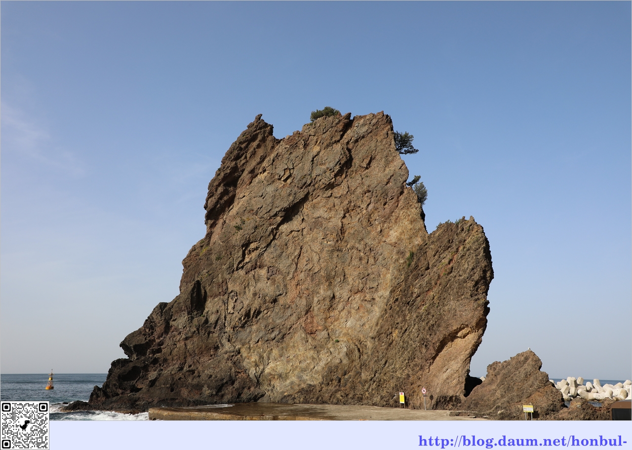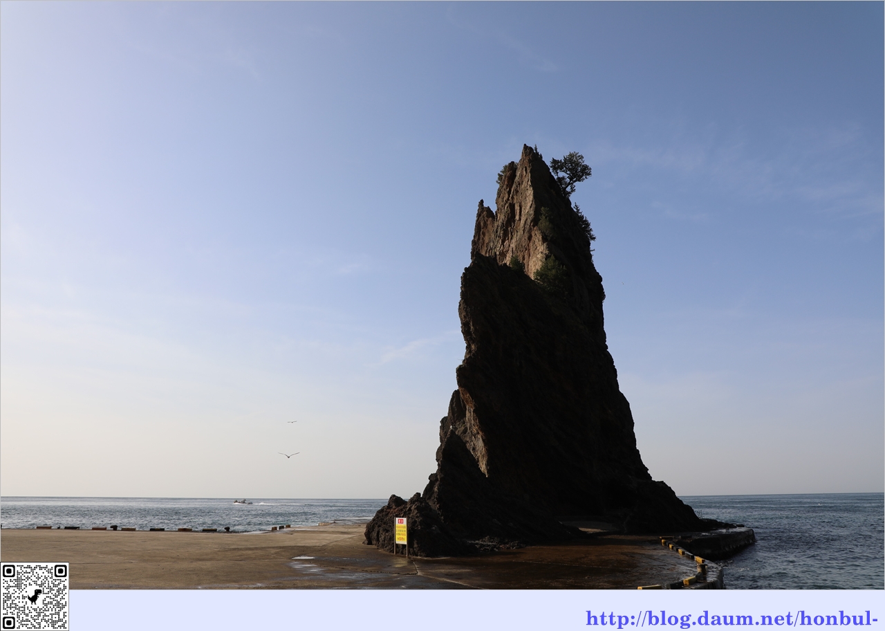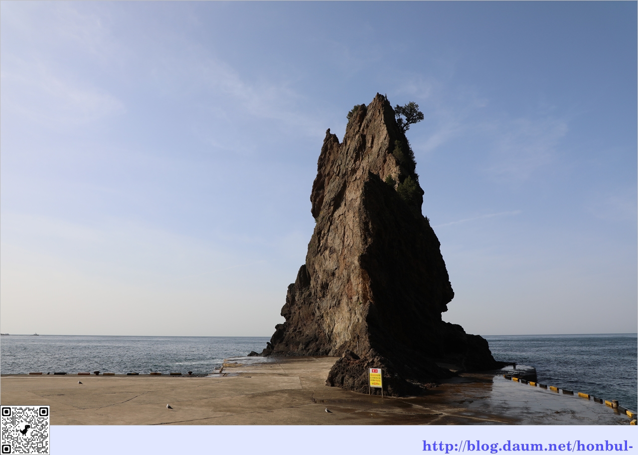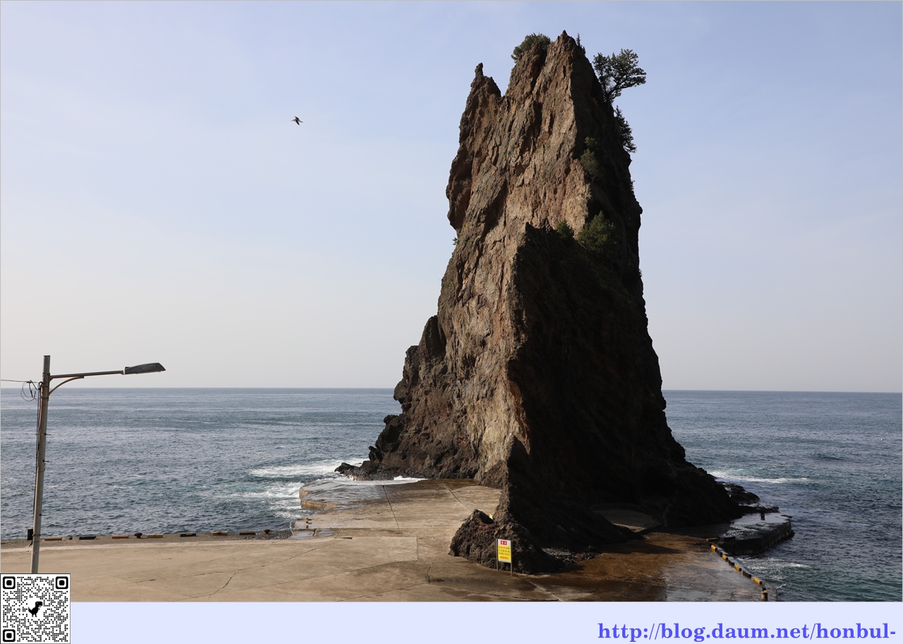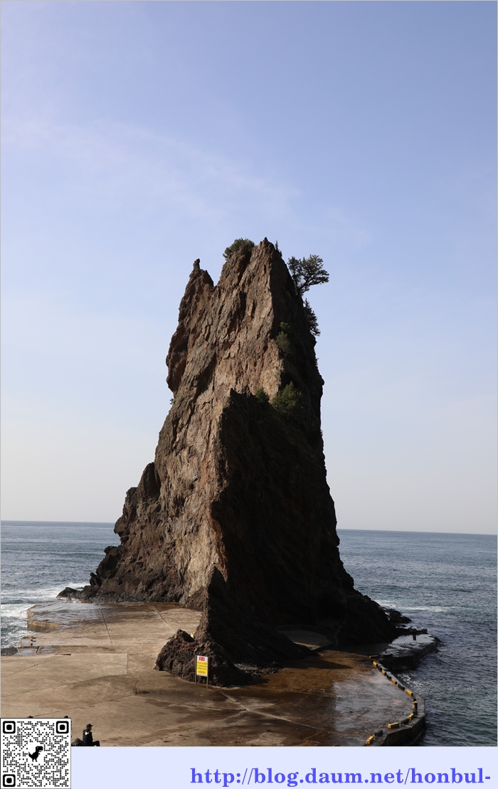 바다를 향해 남쪽으로 서 있기에 동쪽과 서쪽에서 보지 않으면 좁고 길게 솟은 바위로 보인다.