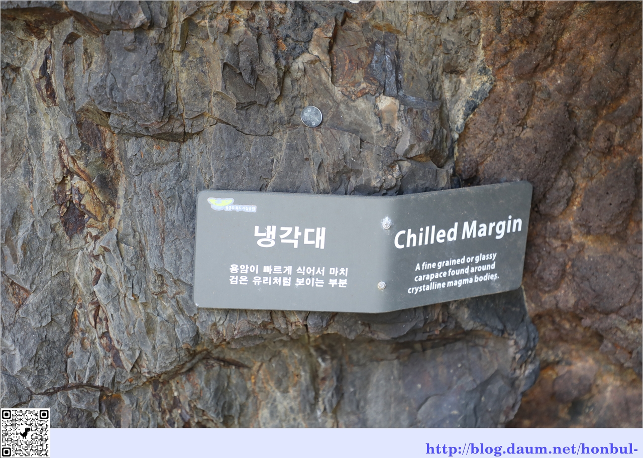 곳곳에 관입한 암맥과 냉각대(chilled margin)를 볼 수 있다.