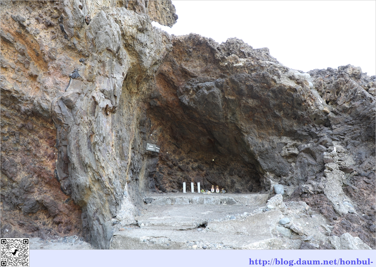 냉각대로 급격히 굳으며 생긴 굴 형태에 누군가 촛불로 치성을 드린다.