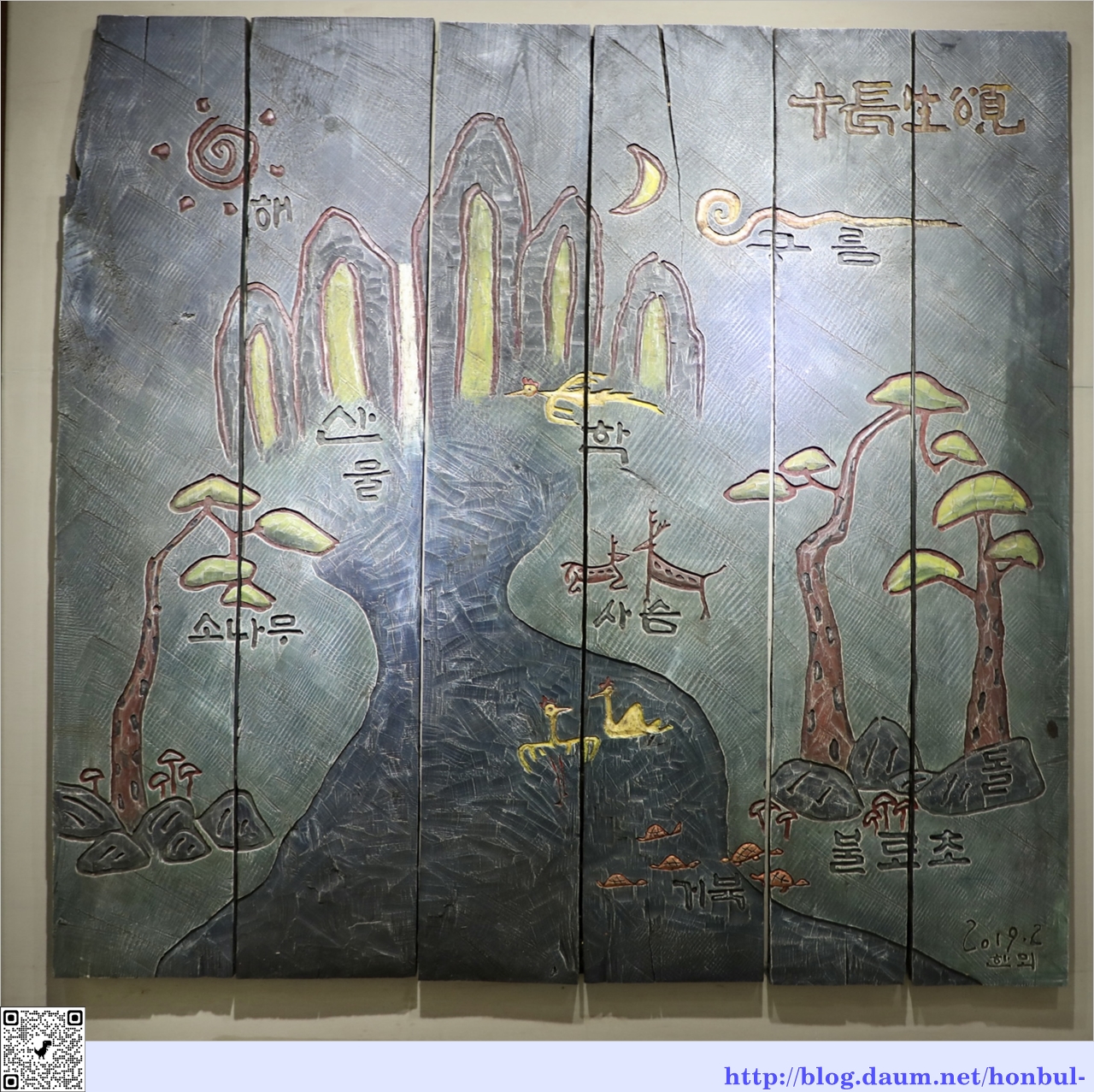 해, 달, 구름, 산, 물, 학, 소나무. 사슴, 거북이, 불로초를 그려 넣었다.