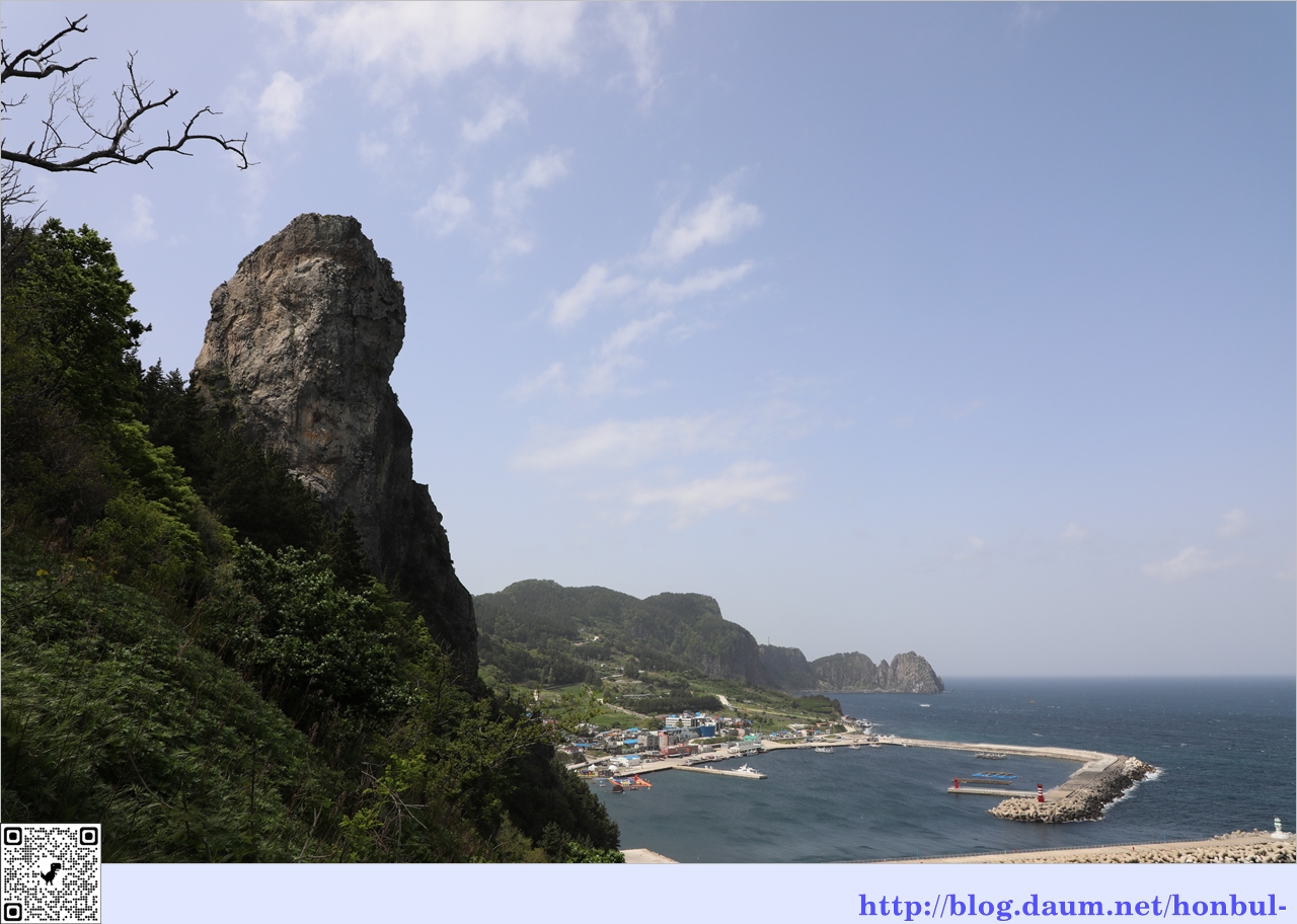 전망대에서 보는 노인봉과 현포항, 그 너머 대풍감이 보인다.