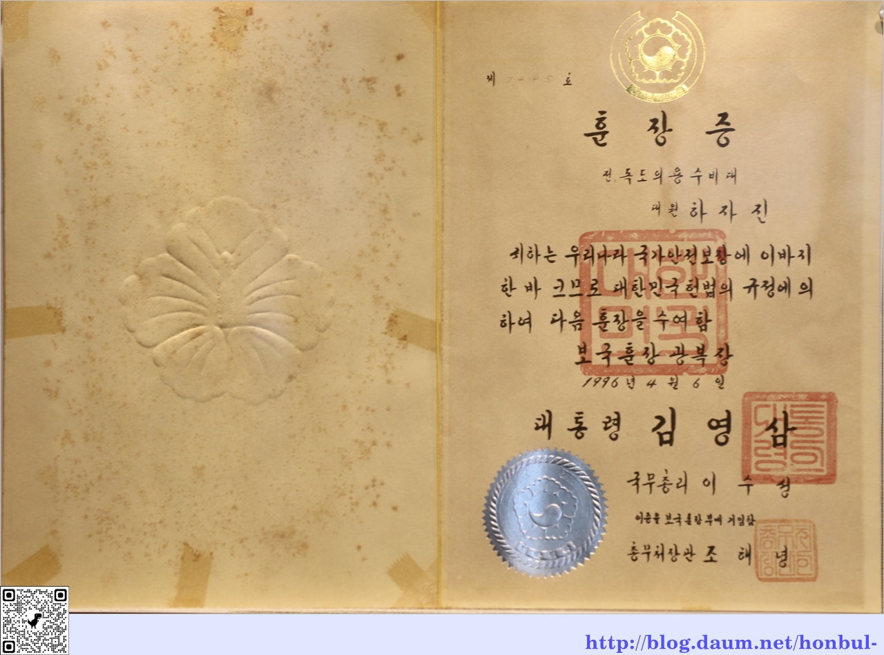 하자진 독도의용수비대 대원의 훈장증
