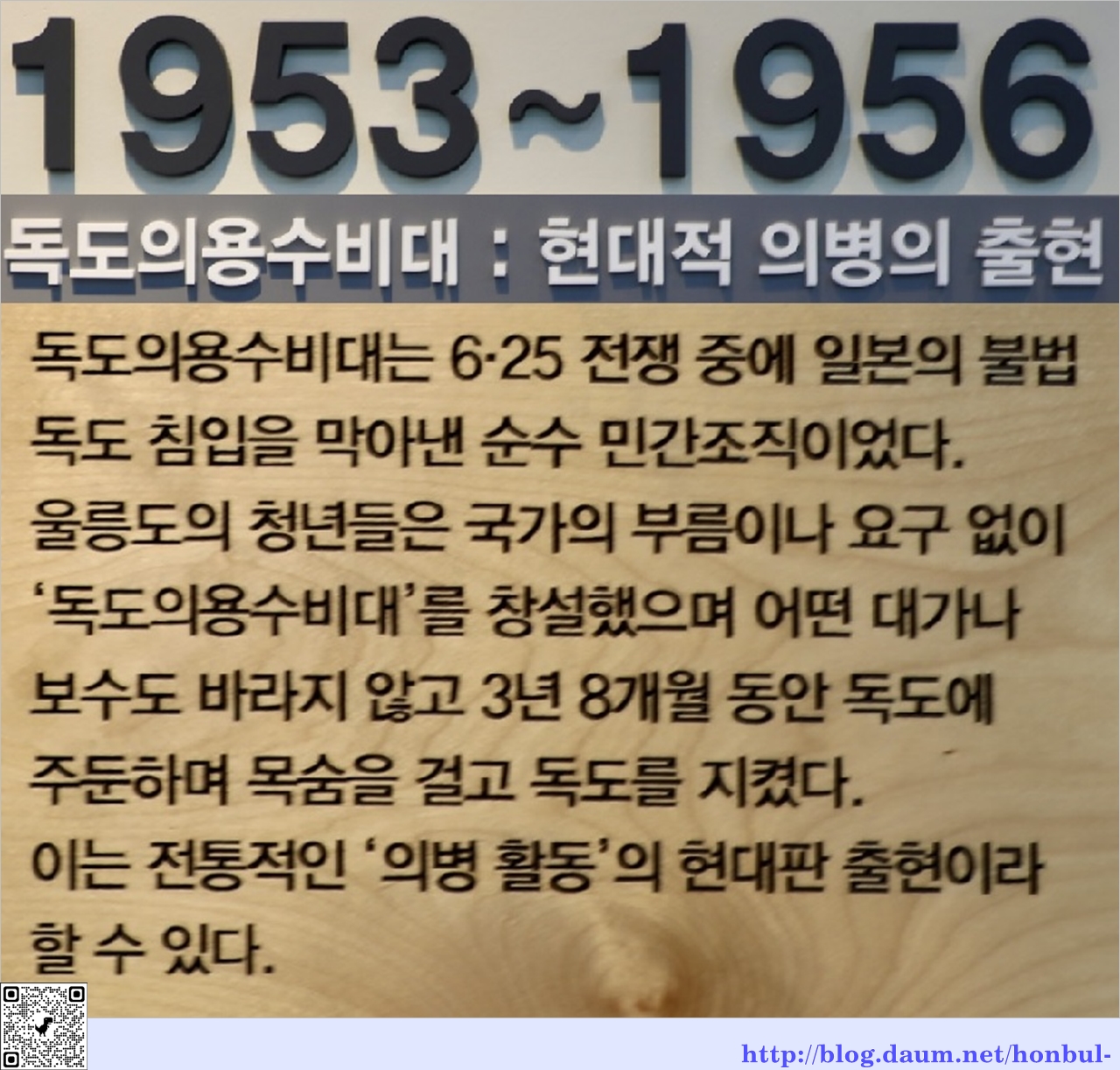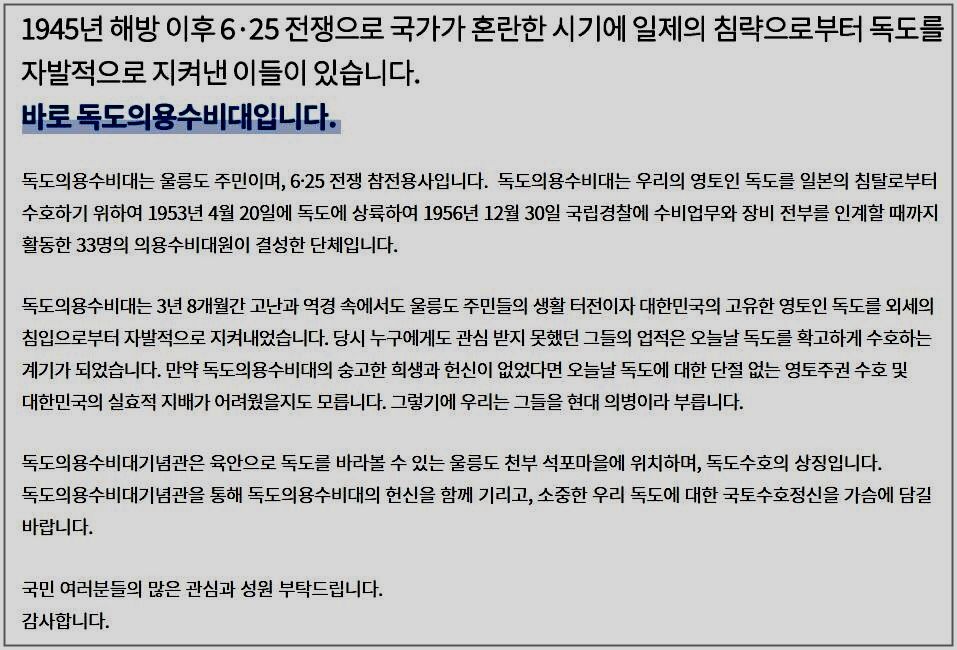 독도의용수비대는 당시 전란 중이던 국가의 지원 없이 울릉도 출신의 독도의용수비대를 결성했다.