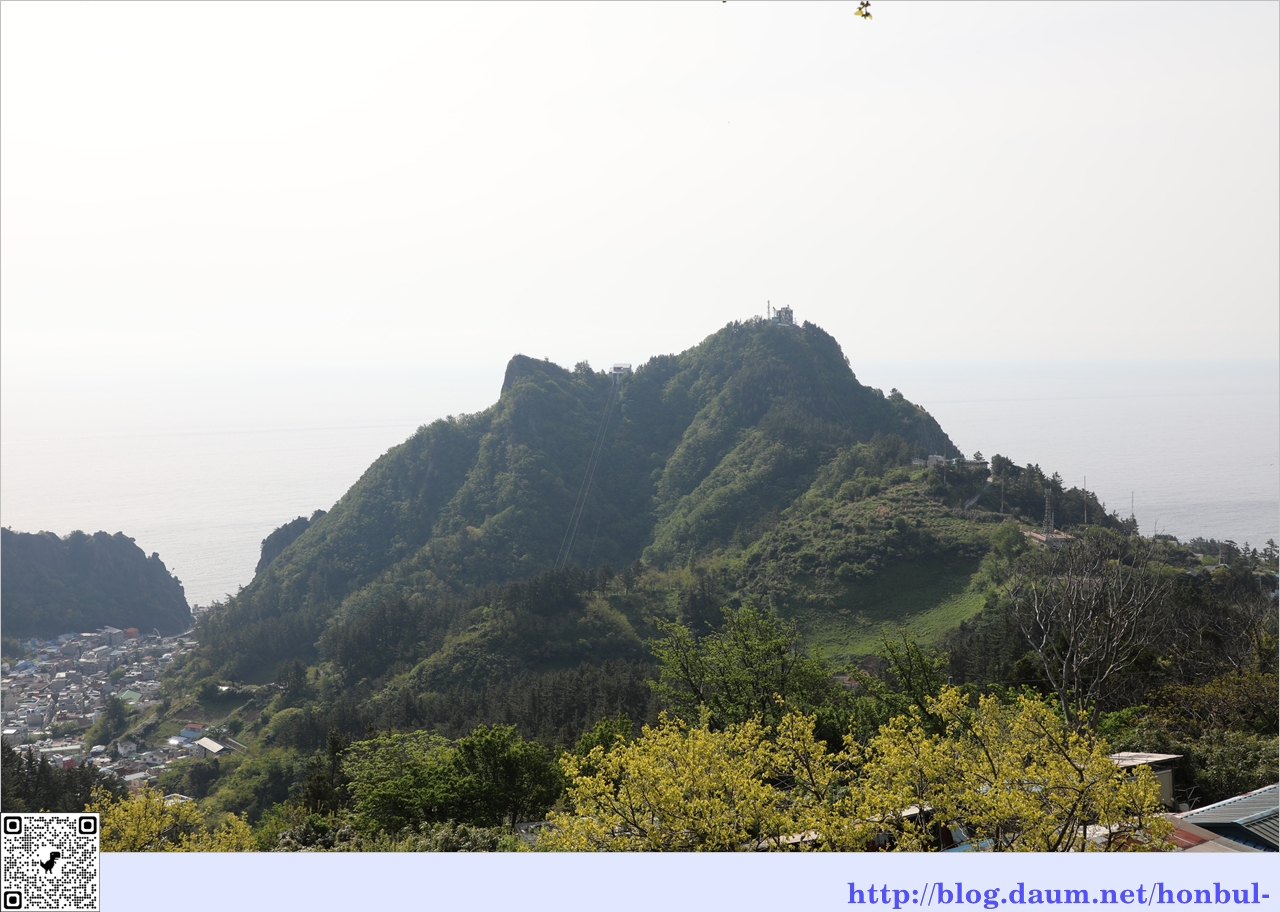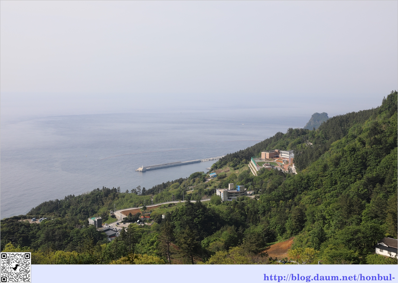 망향봉 군사 시설과 독도 케이블카 전망대가 어렴풋이 보인다.