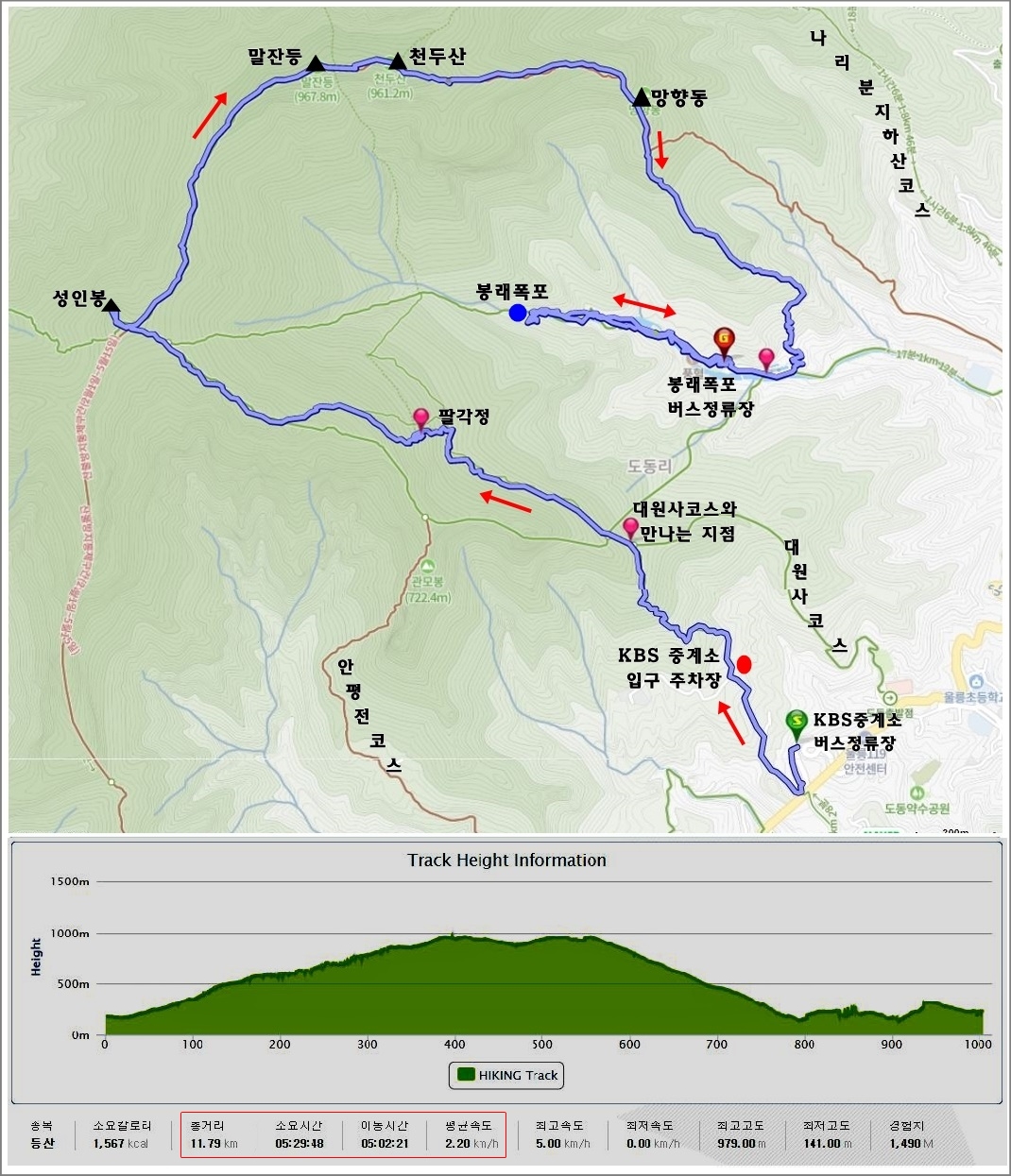 KBS중계소 가는 길의 정류장에서 산행을 시작해 성인봉 찍고 봉래폭포까지 보며